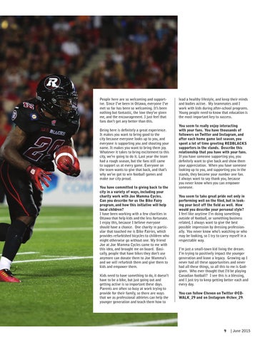 People here are so welcoming and supportive. Since I’ve been in Ottawa, everyone I’ve met so far has been so welcoming. It’s been nothing but fantastic, the love they’ve given me, and the encouragement. I just feel that fans don’t get any better than this. Being here is definitely a great experience. It makes you want to bring good to the city because everyone looks up to you, and everyone is supporting you and shouting your name. It makes you want to bring them joy. Whatever it takes to bring excitement to this city, we’re going to do it. Last year the team had a rough season, but the fans still came to support us at every game. Everyone on the team wants to give that back, and that’s why we’ve got to win football games and make our city proud. You have committed to giving back to the city in a variety of ways, including your charity work with Joe Mamma Cycles. Can you describe for us the Bike Fairy program, and how this initiative will help local children? I have been working with a few charities in Ottawa that help kids and the less fortunate. I enjoy this, because I believe everyone should have a chance. One charity in particular that touched me is Bike Fairies, which provides refurbished bicycles to children who might otherwise go without one. My friend Joe at Joe Mamma Cycles came to me with this idea, and brought me on board. Basically, people that have bikes they don’t use anymore can donate them to Joe Mamma’s and we will refurbish them and give them to kids and empower them. Kids need to have something to do, it doesn’t have to be a bike, but just going out and getting active is so important these days. Parents are often so busy at work trying to provide for their family, so there are ways that we as professional athletes can help the younger generation and teach them how to