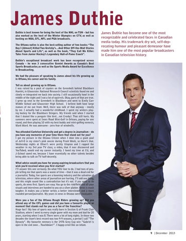 Duthie’s exceptional broadcast work has been recognized across Canada – he won 3 consecutive Gemini Awards as Canada’s Best Sports Broadcaster, as well as the Sports Media Award for Excellence in Broadcasting. We had the pleasure of speaking to James about his life growing up in Ottawa, his career and his family. Tell us about growing up in Ottawa. I was raised by a pack of coyotes on the Greenbelt behind Blackburn Hamlet, in Gloucester. National Research Council scientists found me and slowly re-integrated me back into society. I still occasionally howl in the middle of the night and I eat a lot of squirrels. Okay, parts of that are true. I grew up next to the Greenbelt in Blackburn and went to Emily Carr Middle School and Gloucester High School. I believe both have large statues of me out front. Well, there was talk of that anyway - mostly by me. I actually had a wonderful childhood. I spent my winters playing hockey for the Blackburn Stingers. My friends said when I started that I skated like a penguin (the bird…not Crosby). That still hurts. My summers were spent at Innes Road Mini-Golf in Orleans, paying for one round, and then playing 10 with my best buddy and mini-golfing nemesis, Mark Ward. He was awesome - zero fear of windmills. You attended Carleton University and got a degree in Journalism – do you have any memories of your time there that stand out for you? I got my picture in the Ottawa Citizen when I dove into a giant pool of Jell-O in my sister’s pink onesie during Frosh Week, so there’s that. Wednesday nights at Oliver’s were pretty Utopian and I rapped the weather in my 3rd year TV class; a video, that if ever discovered and YouTubed, would end my career instantly. I loved my time at CU, and J-School saved me, because I have essentially no other talents besides being able to talk on TV half-decently. What advice would you have for young aspiring broadcasters that you wish you’d received when you first started? I’ll answer this one seriously. Do what YOU love to do. I had tons of people telling me that sports was a waste of time—that it was a dead end for a journalist. Today, live sports are a booming industry and the salvation of television, where other areas of journalism are hurting. I’ll add one thing, and this might sound like a contradiction but it’s not: if you want to do sports, do news first. Sports are easy. You go to the rink/field and all your visuals and interviews are handed to you on a silver platter. News is much tougher. It makes you a better writer, a better interviewer and a more rounded person/journalist. My years in news in Ottawa were invaluable. Were you a fan of the Ottawa Rough Riders growing up? Did you attend any of the CFL games and did you have a favourite player or moment that stands out for you as a fan of the franchise? Huge fan!! My love of sports was really born in Section G of Frank Clair Stadium, where I went to every single game with my mom and dad for 20 years, starting when I was 8. There were a lot of long nights. In those two decades the team’s best record was two 9-9 seasons, a period I call “The Dynasty”. My favourite memory is the 1976 Grey Cup win: “Gabriel is open in the end zone…Touchdown!”. I happy-cried like an infant.