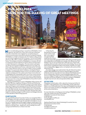 In May 2014, the Pennsylvania Convention Center and four trade labor unions signed a new agreement that modernizes the Center’s work rules and provides expanded exhibitor rights, giving convention groups more independence and flexibility and creating a more efficient show floor. Exhibitors may now set up and tear down within 600 sq. ft. of their booth, something which previously could not be done at the building. They can also look forward to unloading personally owned vehicles using their own equipment, including dollies, luggage carriers, non-hydraulic carts, and two-to-four wheel hand trucks. Since these changes were implemented in May, the National Association of Black MBAs (NBMBAA), the American Industrial Hygiene Association (AIHA), the American Association for Cancer Research (AACR), the Association for Professionals in Infection Control and Epidemiology (APIC), the American College of Emergency Physicians (ACEP) and the American Heart Association (AHA) have all signed on to take their meetings to Philadelphia, citing the improved work rules and expanded exhibitor rights. Getting There Philadelphia’s central location, within a day’s drive of 40 percent of the U.S. population, makes getting there easy and affordable. Amtrak’s 30th Street Station is one of the busiest hubs in the nation and Philadelphia International Airport is serviced by 30 airlines providing flights to 124 domestic cities and 38 international destinations. For more information on booking your next meeting in Philadelphia, contact: Julie Coker Graham, Executive Vice President Philadelphia Convention & Visitors Bureau P: (215) 636-4470 Email: juliec@discoverPHL.com www.MeetPHL.com Stephanie Boyd, Director, Sales & Marketing & Convention Services Pennsylvania Convention Center P: (215) 418-4759 sboyd@paconvention.com www.paconvention.com Facilities & Destinations 2015 Superbook