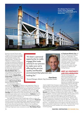the two is minimal, Dennis notes. at Tropicana Atlantic City will “Our job is not so much to compete link the Tropicana and Chelsea locally as it is to compete regionally Tower via a skybridge. The “It’s been a personal and nationally to bring in that Borgata’s improvement project, opportunity to really larger business.” The $250 million completed last year, included the Waterfront Conference Center opening of a 3,200-sq.-ft. outdoor engage [the trade includes two 50,000-sq.-ft. ballrooms pool; beer garden; Premier, (divisible into 29 sections), making it an 18,000-sq.-ft. nightclub; unions] in our process the largest convention center–hotel and a new restaurant concept, to make sure we’re complex from Baltimore to Boston. Angeline, by celebrity chef Its facilities are directly accessible Michael Symon. offering the service, from the 2,587 guestrooms at quality and flexible Harrah’s Atlantic City. Some MEET AC: CONTINUITY nice conference center options for environment that planners are AND COLLABORATION smaller groups have also come The best starting point for online, including Borgata Hotel looking for.” selecting among Atlantic City’s Casino & Spa’s 18,000-sq.-ft. Central —Dean Dennis, prime meeting facilities is the Conference Center (opened in May) General Manager, Atlantic City Convention Center Meet AC, a one-stop shop for and the 15,000-sq.-ft. conference all the city has to offer. And center at Resorts Casino Hotel planners can establish long-lasting (opened September 2015). relationships with the sales staff, Among several notable rewhich is helpful when bringing in repeat business. “We have a steady openings, the Taj Mahal will deliver a new experience when it is staff that’s been on board with us since the formation of Meet AC,” says introduced as a Hard Rock property on Memorial Day weekend Wood. “There is continuity with our convention services team as well.” next year. Hard Rock International has purchased the Trump hotel Collaboration is also a hallmark of Atlantic City’s meetings and is investing $500 million in a property-wide renovation and industry these days: “We at Spectra are engaged fully with Gary to create a Hard Rock Casino and Hard Rock Café. In 2014, The Musich [Vice President of Sales] and his team at Meet AC,” Dennis Claridge hotel reopened as a fully restored historic hotel with 483 says. In addition, “we have a great relationship with the trade unions renovated guest rooms and is now branded as a Radisson hotel. In here. It’s been a personal opportunity to really engage them in 2016, the hotel added 15,000 sq. ft. of meeting space, bringing the our process to make sure we’re offering the service, quality and total meeting space to 100,000 sq. ft. flexible environment that planners are looking for.” Overall, “there Two major renovations, each roughly $50 million in value, will are very collaborative initiatives in the city right now,” he observes. also benefit Atlantic City-bound groups: The 2,129-room Tropicana “From CRDA leadership on to Meet AC, our teams, our unions, our recently enhanced its Boardwalk façade, upgraded its guestrooms partners — everybody seems to be rolling in the right direction. It’s and opened the multimillion-dollar AtlantiCare LifeCenter, billed been a very positive experience to walk into.” The teamwork among as the most advanced gym facility in Atlantic City. In addition, these parties will surely translate into a similar experience for Tropicana has purchased The Chelsea Hotel; the additional tower incoming groups. will bring Tropicana’s room inventory to 2,730. The Chelsea Tower 16