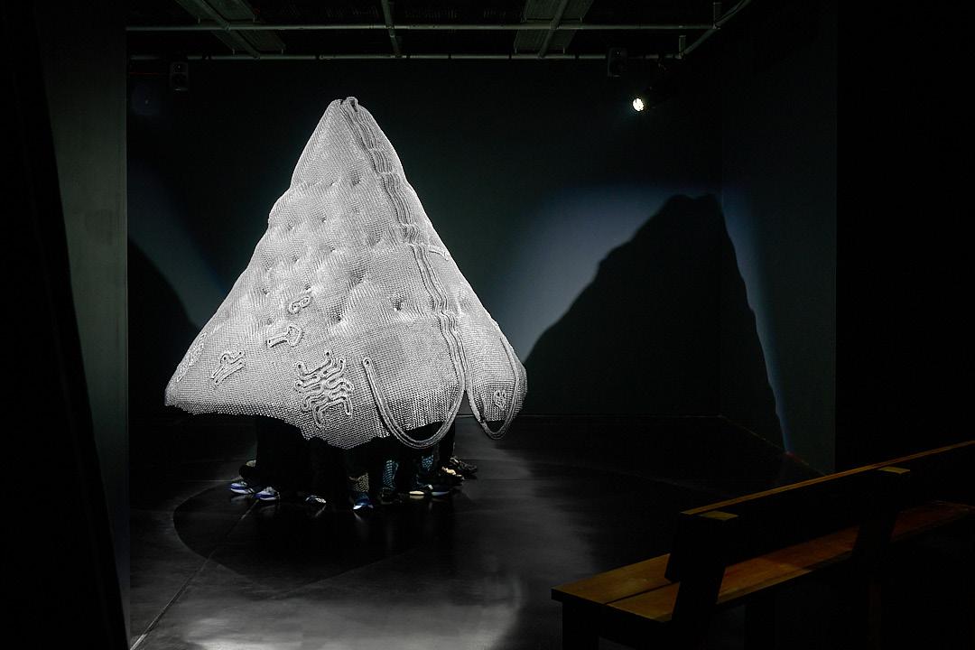 In the darkened gallery installation, the massive illuminated armoured cloak holds your attention – its form is reminiscent of a quilted duvet, clutched tight at the head, supported by the legs of those who hold it up. The people are represented by their shoes, which are visible under the cloak’s edges. The suit faces two rows of church pews. An accompanying soundscape uses well-known songs, slowed or distorted, to conjure ‘a place for reflection – a space of both judgement and salvation’.