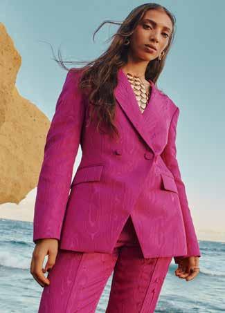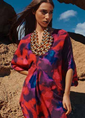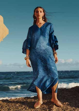 Bright accents, decadent flowing fabrics and layerable styles make festive dressing easy. Amidst the flowing kaftans, dresses and layered sets, the collection provides inviting colours and eye-catching, vivid prints. Pieces from the Ramadan Kareem drop to note are a bold royal blue shirt dress, a tunic set in a graphic design and the vibrant orange blazer and trouser set. The warm gold fringe skirt and the magenta pink, floor-length, ruffle-hem dress are key from the Eid Ready drop.