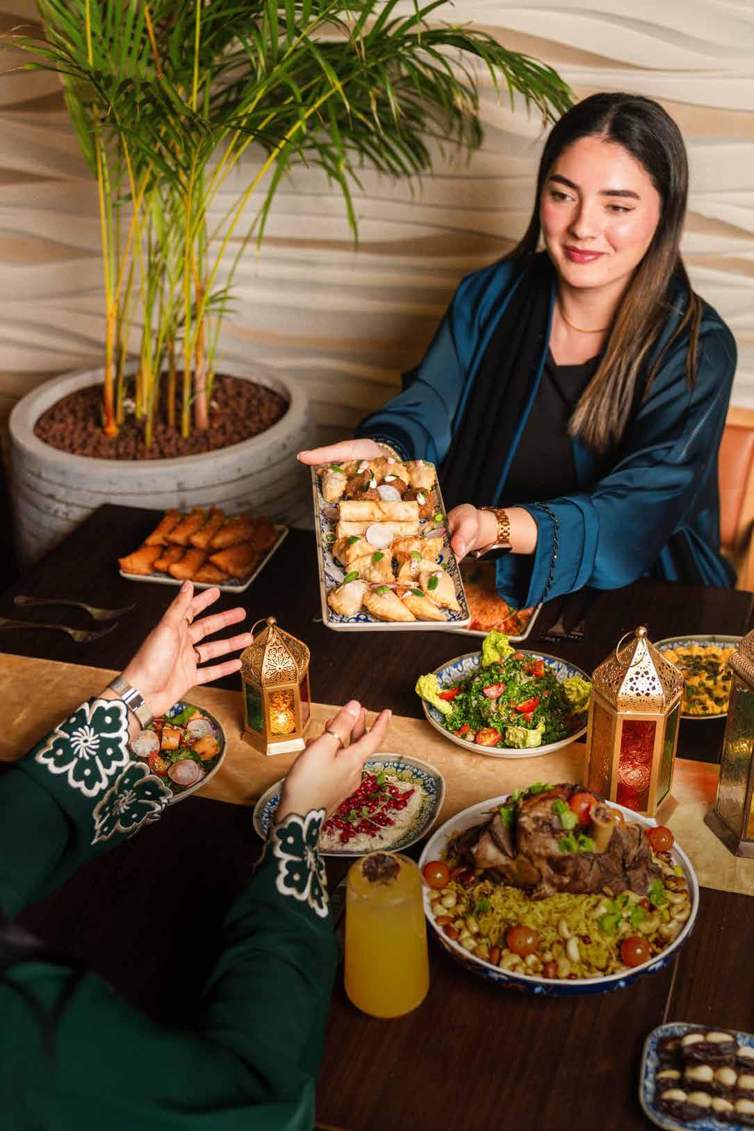 Oumsiat Ramadan unfolds within an elegant tent wrapped by warm fabrics, patterned details, and lantern-lit touches. At the center, a generous buffet and live cooking stations are served from Iftar through Suhour, allowing the evening to move at its own pace.