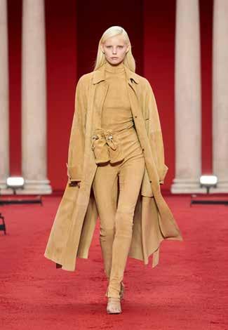 This fresh language of luxury blends contemporary clarity with the purity of Florentine drape: an homage to the home of the house. Ethereal elegance materialises through sheer knits, liquid silk and layers of organza, but appears grounded by suede sandals drawn from Renaissance reality, and the tangible allure of polished accessories.