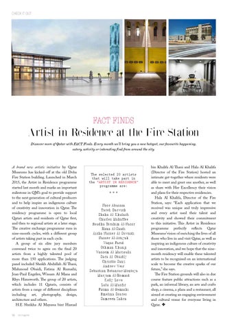 bin Khalifa Al Thani and Hala Al Khalifa (Director of the Fire Station) hosted an intimate get-together where residents were able to meet and greet one another, as well as share with Her Excellency their vision and plans for their respective residencies. Hala Al Khalifa, Director of the Fire Station, says: “Each application that we received was unique and truly impressive and every artist used their talent and creativity and showed their commitment to this initiative. This Artist in Residence programme perfectly reflects Qatar Museums’ vision of enriching the lives of all those who live in and visit Qatar, as well as inspiring an indigenous culture of creativity and innovation, and we hope that the ninemonth residency will enable these talented artists to be recognised on an international scale to become the creative sparks of our future,” she says. The Fire Station grounds will also in due course feature public attractions such as a park, an informal library, an arts and crafts shop, a cinema, a plaza and a restaurant, all aimed at creating an engaging environment and cultural venue for everyone living in Qatar. ✤