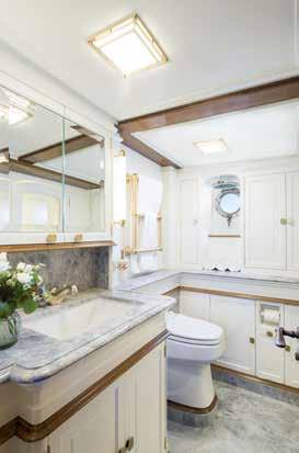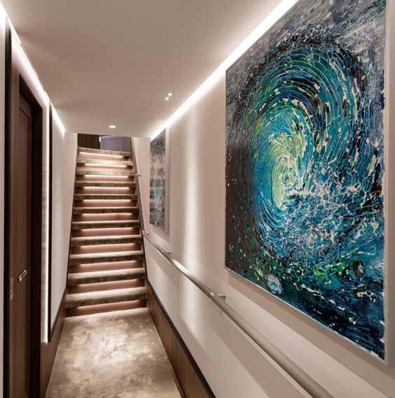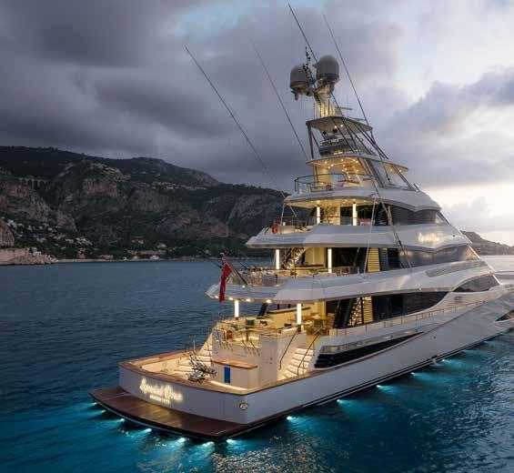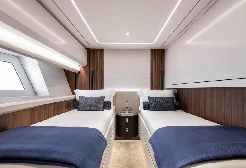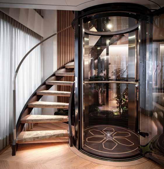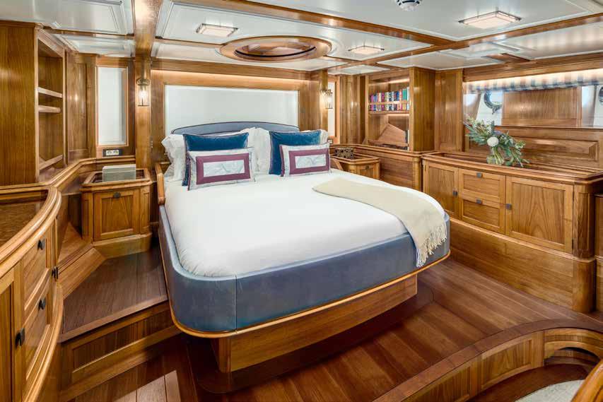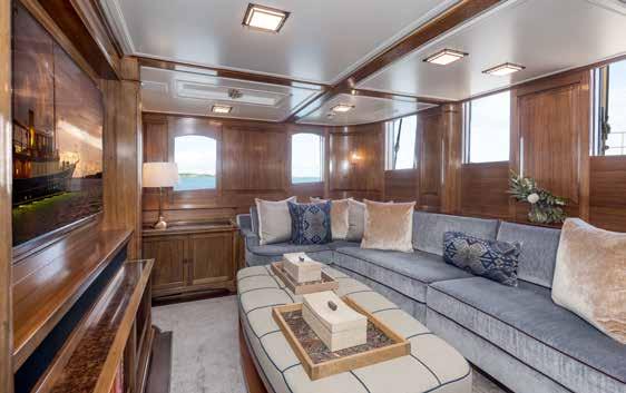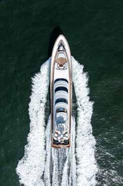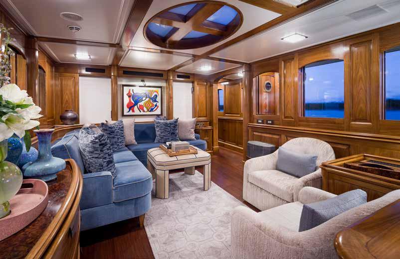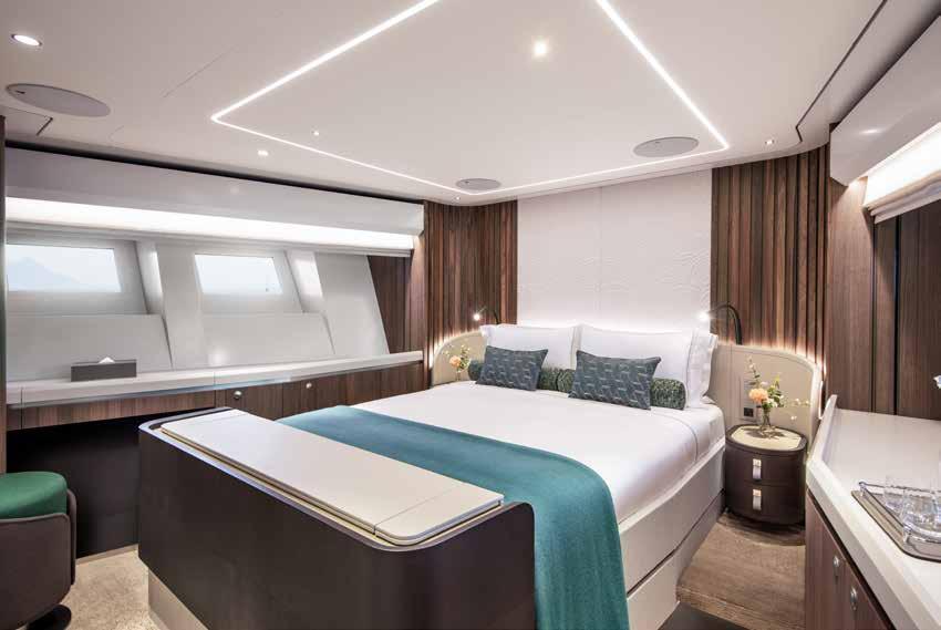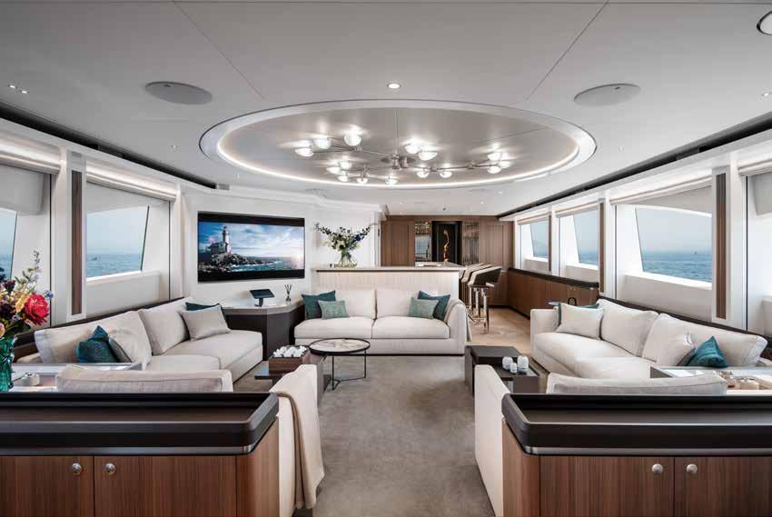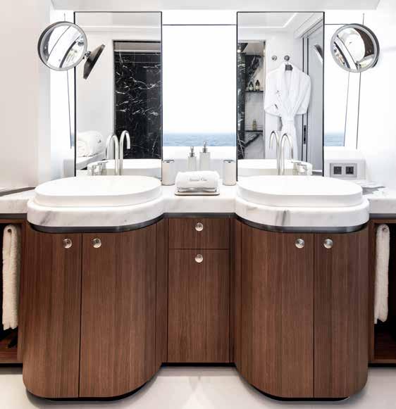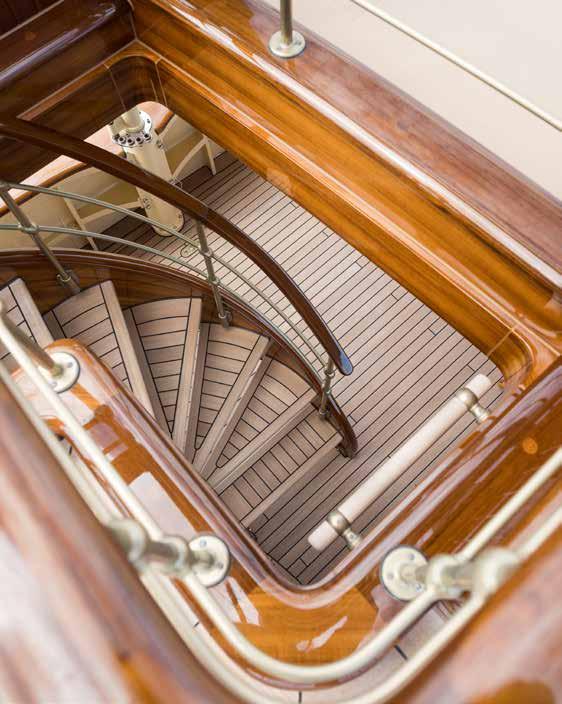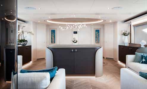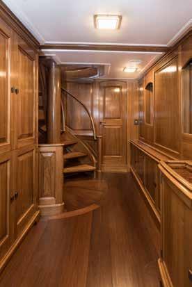 The vessel boasts five staterooms for the owner’s party, including two stretching full beam, and the interior features stunning walnut joinery, exotic stonework and bespoke furnishings alongside a unique, threeperson pneumatic glass-enclosed elevator.