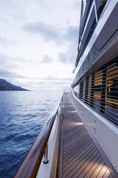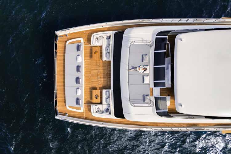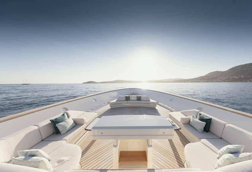 modified wood reduces surface heat by 16% and offers over 25% better thermal insulation. The high-quality alternatives meet both aesthetic and environmental standards, as well as being ‘a game-changer’ in terms of maintenance. And feedback from both sailing and motor yacht owners has been positive. For some models, such as the high-performance hybrid catamaran, the ULTIMA 55, aesthetics and weight were key priorities, so Nicolas explained that a premium synthetic solution had been achieved, which still addresses the sustainability issue.