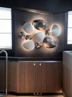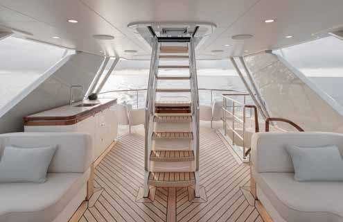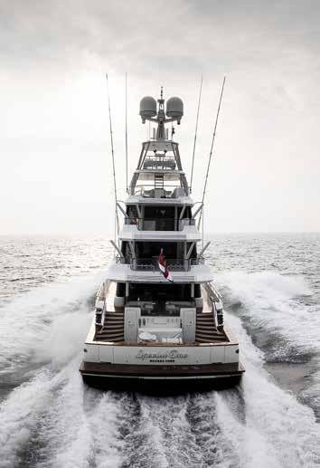 have decorative inlays of oak strips while the overhead is a mix of white leather and glosspainted strips for interest. Ambient lighting is built into the toe kicks of the walls as well as the custom furniture. This multi-use room has an oval dining table forward with seating for eight under a modern, low-profile chandelier. While large windows port and starboard invite looking out, the aft glass bulkhead invites guests outward onto the mezzanine deck. While all large sportfishing yachts have a mezzanine deck with seating overlooking the cockpit where guests can safely watch the unfolding theatre of the sea, that aboard Special One is like no other. Comfy, shaded seating areas offer the option of looking aft or ahead toward the main al fresco dining area. Under cover of the overhanging upper deck and sheltered additionally by louvres port and starboard, this ambitious and inviting mezzanine flows from the main salon, past the al fresco dining area, to a big terrace where curved, plush sofas allow guests to observe fishing action or simply watch the miles roll away. Backlit pillars echo the elegance of the interior, as does the show-stopping, bespoke, hand-blown glass chandelier over the dining table. A passarelle can roll out from under the mezzanine directly to the dock for comfort in disembarking. Twin curved stairways link the mezzanine to the large cockpit below. To accomplish the yacht’s primary purpose, this fishing cockpit offers tuna tubes, floodlights and saltwater ice chip machines to preserve the catch in a pair of fish boxes below the cockpit. Outside, the fish fighting chair is a bespoke work of art that can be raised or lowered per the angler’s wishes.