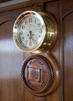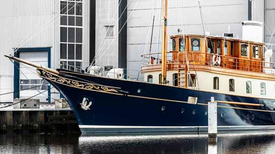 In November 2023, she sailed away from Huisfit after a full rebuild with 40% of her hull, deck and frames replaced, her interior fully reimagined and every onboard system, except her original Gardner diesels, fully overhauled or replaced. The Huisfit team had studied, scanned and redesigned the boat in 3D. The entire teak deckhouse was lifted off in one piece for restoration, preservation, strengthening and refinishing in a dust-free environment. Decorative teak moldings were added to embellish the bright-finished exterior. Every piece of deck hardware, including port hole covers, was removed and catalogued for restoration. While keeping the 1930s’ profile, the owners wanted to simplify the style of the interior, a task entrusted to deVosdeVries design and involving an artful antiqued finish created by an intensive 200-year-old process requiring a 14-step finish of bleaching, colouring, French polishing and distressing, all by hand.
