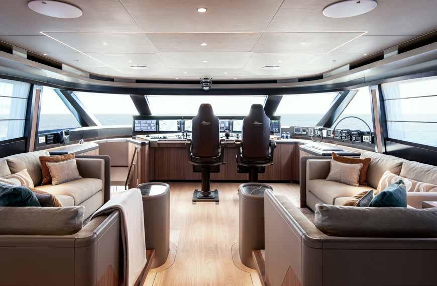 One deck higher still, in the open wheelhouse, the state-of-the-art bridge with its twin helm seats adjoins a second guest lounge of sumptuous quality. A pair of raised sofas aft in the wheelhouse, gives the owner a private, cosy corner with a clear view of the sea and keeps him close to the captain when underway. Aft of the bridge is sunny, open deck seating.