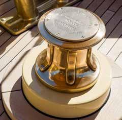 As much of the original exterior teak as possible, including massive cap rails, was saved, restored and pieced back in with new wood. So, too, were the winches, which are thought to be 60- to 70-years-old. All salvageable hardware was overhauled and polished, and both old and new pieces were given an aluminum-bronze chemical treatment for a smooth, satin, slightly patinaed, finish.