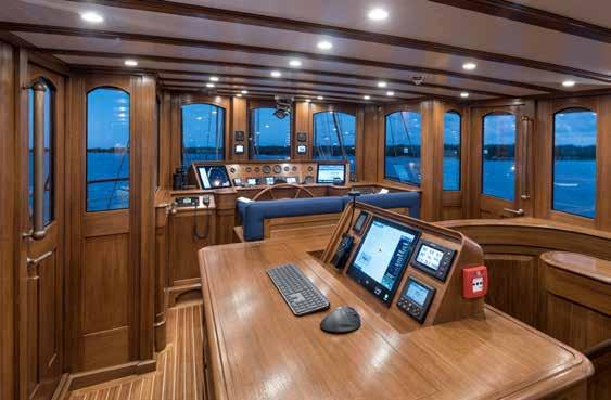 One of the biggest changes is that the former indoor dining saloon overlooking the foredeck is now a comfortable media room with a welcoming overstuffed sofa and chairs upholstered in a linen-textured off-white shade. Dining has moved to the aft deck under a fixed bimini awning with removable weather curtains. An enormous custom table on centreline showcases the joiner’s skill with a diamond design and glass-like surface finish. Comfortable, padded captain’s chairs are easy to position at will or store on passages. A small, matching teak cabinet nestled between the curved steps to the upper deck and the door to the saloon facilitates meal service. The fantail is filled with large cushions and pillows for lounging. The wheelhouse is the only area of the yacht with a teak interior matching the varnished teak brightwork outside. It’s a nice homage to tradition. Ninety-five percent of the exterior bronze fittings are original and beautifully restored. With every original overhead removed, redoing the lighting plan was an easy decision and deVosdeVries design brought in the same type of ambient lighting the owners enjoy on their other vessel.