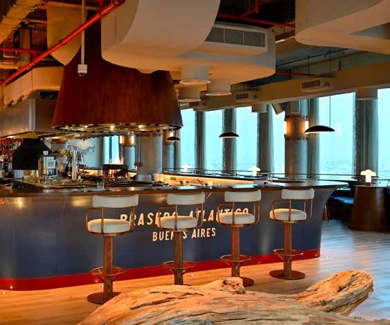Many of the exterior walls are glass, affording breathtaking views over the city’s glittering lights, while, on the internal walls, you’ll spot line drawn images of a sea monster –Brasero’s much-loved mascot. Certainly eyecatching and definitely a conversation point, General Manager Rodrigo Carvalho told us the restaurant’s whole ethos is built around the ocean and they wanted to honour that by creating their own sea creature.