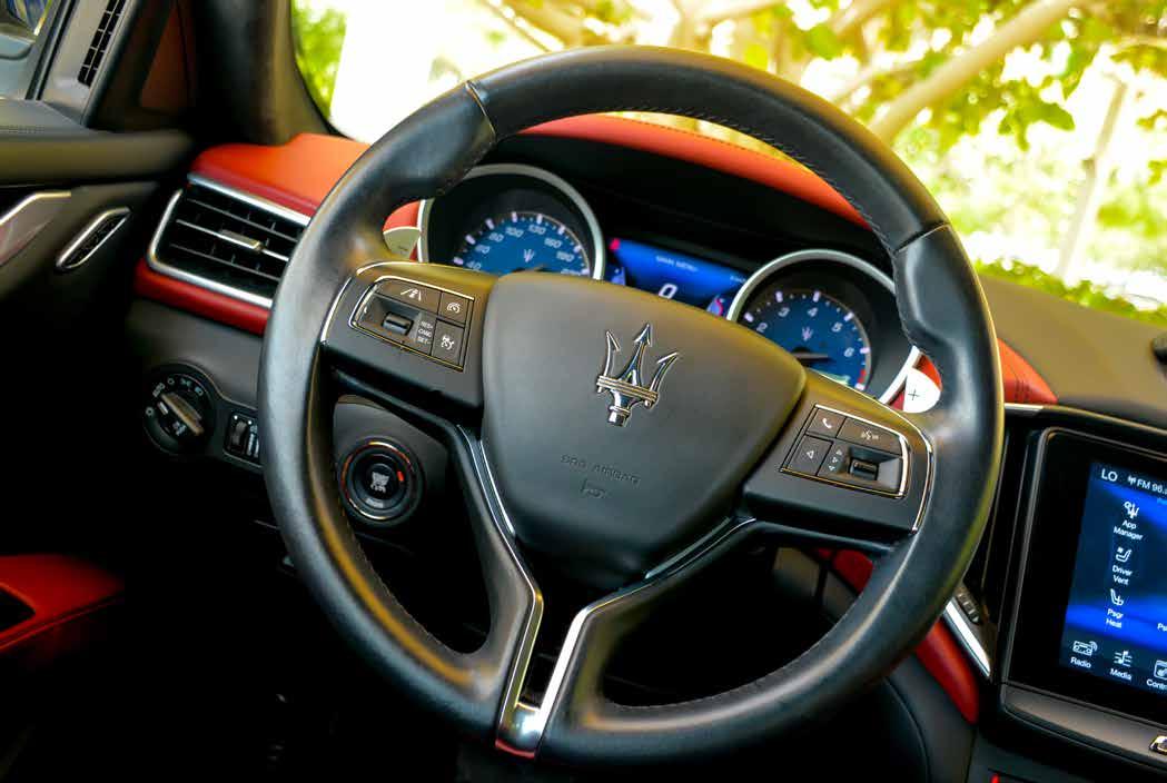 mobile phones. Practical luxury, anyone? The interior of this Maserati is built around an intuitive, user-friendly driver interface. The central console incorporates the driving modes’ buttons alongside the gearshift. Other on-board settings can be adjusted via the Maserati Touch Control Plus (MTC+) at the centre of the dashboard, or on the steering wheel controls for the 7” TFT display. The infotainment system of the Ghibli, is based on a high resolution 8.4” capacitive touch screen and offers compatibility with both Apple CarPlay and Android Auto mirroring functions. The central lower console’s rotary knob is a high quality forged aluminium component offering intuitive control of audio volume and other infotainment system functions. As we started to fully appreciate all of the details that have so lovingly been put into the design of this car, it was time for us to get out on the road. The sound of a petrol 600 V6, Twin-Turbo – direct injection GDI engine is enough to put an instant smile on anyone’s face. In truth, we were not expecting the kind of power we felt as we eased down on the accelerator. With a displacement of 2979cc’s and 2250 Nm of Torque, this car is no toy! Bulleting from 0-100 km/h in only 5.5 seconds and a top speed of 267 km/h, we could only chucckle as we felt our bodies pressing back against our seats. Complete with an 8-speed ZF automatic AT8 –HP70 gearbox, the Ghibli effortlessly eats up any road put in front of it whilst giving one a sense of full control thanks to the abundance of grip and handling on offer. This is one fun car to drive – and looks stunning too!