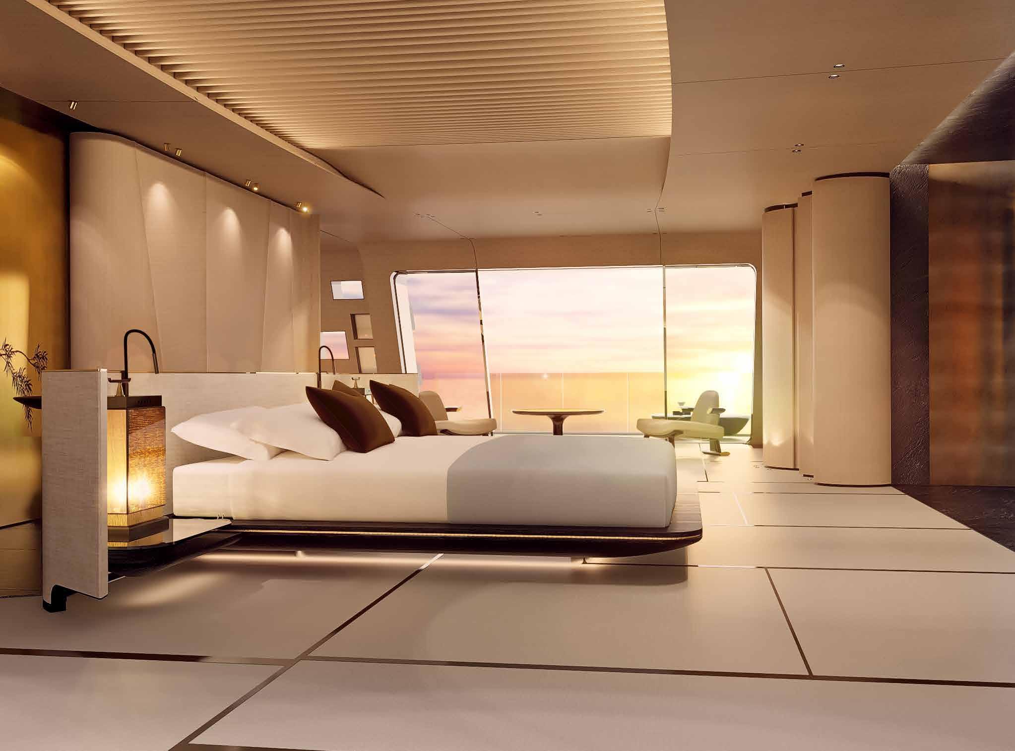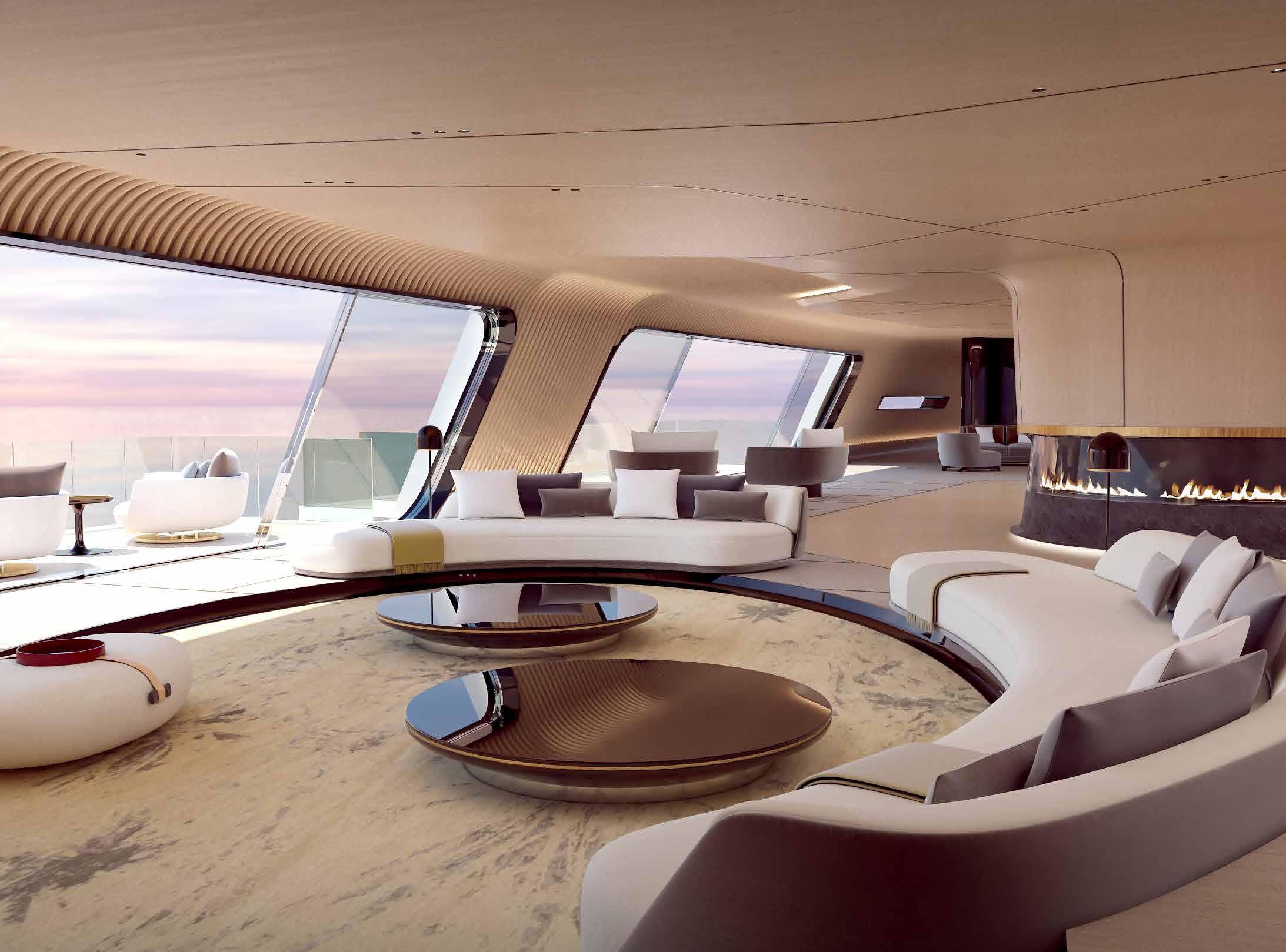 Lobanov’s masterful exterior design works well with the interior and is inherently flexible so that the yacht can be designed in any size from 80 to 120 meters in length.