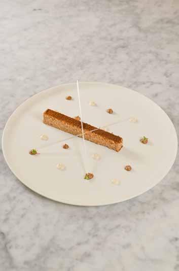 our sweet tooth with the signature creations from Chef Yazid Ichemrahen, World Pastry Champion. We had the 100% Vanille, a sleeklooking dessert layered with a base of biscuit noisette (ground hazelnut), on top of this, a thin gianduja paste, then a thick vanilla cream (where you can spot loads of black seeds) covered with a thin vanilla enrobage (a sugarand chocolate-based coating for confections). The name says it all: it is a vanilla concoction. The smell hit our nostrils before we tasted it, and the intense flavour was well balanced with the other ingredients’ lightness. I can say that it was the most perfect vanilla bite I ever had in my life. The other dessert was the Grand Cru Café. This one played with our taste buds; the different textures have a big role here. The coffee cloud, as one of my dining companions described it, was composed of a fine streusel (a more floury crumb), praline, iced coffee, caramel and caramelised hazelnut. You have to eat it as a spoonful, and the ingredients dance in your mouth; it gives a sensation that I can only recommend trying as the best way to describe it.