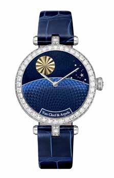 A celestial ballet unfolds on the dial of the Lady Arpels Jour Nuit and Lady Jour Nuit watches, where diamond-paved moons and stars perpetually chase the sun. Crafted with meticulous attention to detail, these timepieces feature a 24-hour rotating disc that gradually transforms the dial, capturing the magic of a starry night sky. Murano aventurine glass adds depth and brilliance to the celestial tableau, while enamel decal techniques bring the scene to life with vibrant hues and delicate details. Available in 33mm and 38mm cases, these watches are a tribute to Van Cleef & Arpels’ timeless ‘Poetry of Time’.
