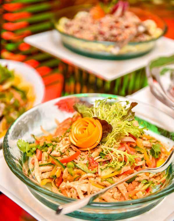 After unleashing their recent ChineseMalaysian à la carte menu and unrivalled buffet we made a reservation instantly and ventured towards our beloved capital. As we meandered towards the impressive entrance of Soie, along a corridor lined with highly polished black marble, the inviting aromas of lemongrass, ginger and soy encouraged us to quicken our pace just a little. The floor-to-ceiling polished wooden doors give the impression of entering a lavish oriental palace and we were keen to discover what was hidden behind them. The staging and décor at Soie is the epitome of resplendent oriental decadence. Dark wood, shuttered windows, exquisitely decorated fans and Chinese lanterns suspended from the high ceilings combined with draped fabrics and muted lighting very much form part of the dining experience. The central part of the seating area is housed within a vast open pagoda and is simply stunning.