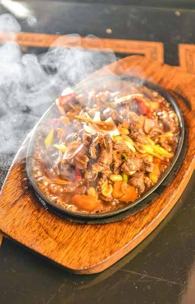 such as Malaysian Spicy Squid and a choice of Satay skewers will begin to satisfy your cravings. Each dish is presented with elegant simplicity and hosts are knowledgeable regarding the flavour profiles and origin of each dish. Traditional familiarity such as Rendang Beef and Seafood Curry is offset by options such as Adabi Grilled Fish, Buttered Mango Crispy Chicken, Kung Pao Sizzling Beef and Duck with Black Fungus and Pickled Cabbage. In addition, vegetarians can combine dishes with real ‘zing’ such as Sambal Kangkong or Turmeric Powder fried vegetables with one of the generous noodle and rice dishes. The menu has been designed to cater for all manner of tastes and levels of experience with oriental cuisine providing both a broad range of dishes which are deeply rooted in classical Chinese and Malaysian techniques.