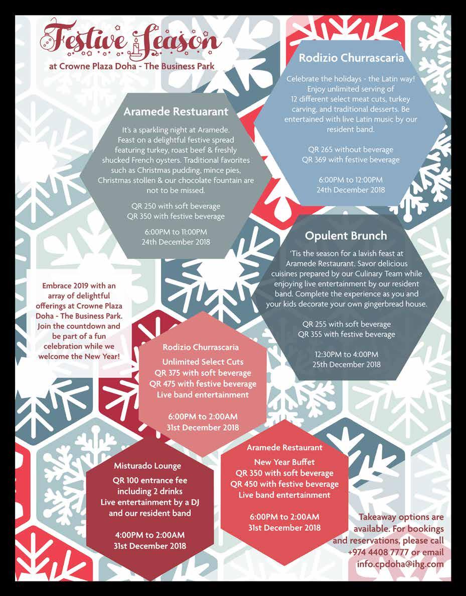 Celebrate New Year’s Eve like never before with a vibrant extravaganza at El Faro! Count down the clock to 2019 and end the year on a Spanish note as you delve into the New Year celebration with a traditional Spanish family sharing menu, followed by an evening of vibrant entertainment by their live band. QR410 per person including soft drinks, QR150 additional per person for vino package, QR150 for kids aged 6 to 12 and kids aged 6 and under dine for free. The fun begins 7 pm onwards! Call 40355555 for reservations and more information.