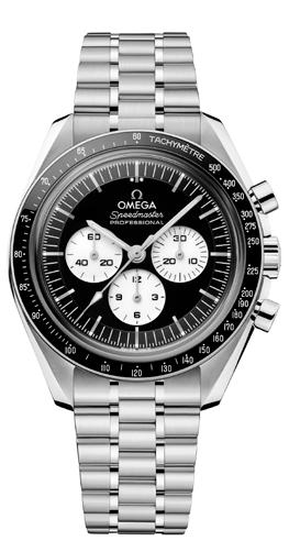 In addition to the black-and-white dial, the new watches feature black ceramic bezel rings with a white enamel tachymeter scale. The front features a box-form scratch-resistant sapphire crystal with an anti-reflective treatment. The straps are polished-brushed bracelets, crafted in the standard Moonwatch style with OMEGA’s patented comfort-release adjustment system. The two 42mm choices include a stainless steel version with all hands and hour markers in rhodium plated with white Super-LumiNova. The other version is in 18-carat Moonshine Gold, OMEGA’s own long-lasting yellow gold alloy, that covers the hour-minute hands, subdial hands and hour markers with white Super-LumiNova, as well as a central chronograph hand in PVD Moonshine Gold.