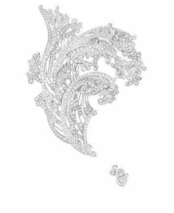The Vague brooch/hair jewel is a tribute to the untamed power of the sea. Echoing a 1910 tiara from Boucheron’s archives, this item is inspired by Hokusai’s iconic wave, The Great Wave off Kanagawa. Crafted using the lost-wax casting technique, it features 851 round diamonds set in white gold, capturing the wave’s movement and energy in a design that is both poetic and powerful, amounting to a total of 20 carats.