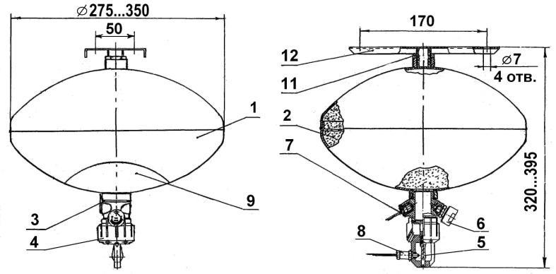 General view of base modifications modules (SPRUT-1v, SPRUT-1s, SPRUT-3v, SPRUT3s, SPRUT-6v, SPRUT-6s, SPRUT-9v, SPRUT-9s, SPRUT-12v, SPRUT-12s, SPRUT-15v, SPRUT-15s) is given on fig. 1. Modules consist of ellipsoid form vessel 1 with charge EP 2, which is under pressure of working gas 1,4 MPa (14 kgs/cm-2). Locking spray-type device 3 (constructive variants LSTDv or LSTDs) is installed in opening of the vessel. LSTD includes sprayer 4 (correspondingly combined and jet-stream; on fig 1. – combined) with heat lock in the form of glass bulb 5, pressure indicator 6 and pressure signaling device 7. Electromechanical actuator 8 is installed on sprayer 4, it is connected with control panel. The marking accordingly to normative requirements is marked on label 9. Block-screw 10 is mounted in LSTDv or LSTDs in order to prevent unauthorized triggering during transportation or mounting. After mounting the module, block-screw is deleted. Threaded connecting pipe 11 is welded to the vessel for connection with bracket 12, which is fixed on the ceiling of protected premise or on other horizontal construction with the help of four screws (dowels).