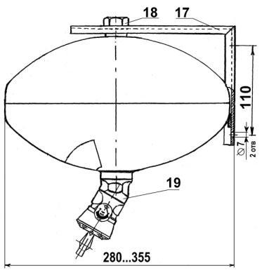 Illustrates general view of base modification SPRUT modules for mounting on the wall. For their mounting on vertical surface the bracket 17 and screw 18 are used. For providing effective distribution of fire-extinguishing powder in protected zone, which is given from the module of this construction, the angle bar 19 is mounted in inlet of the vessel, with 45 angle, to which LSTD is connected