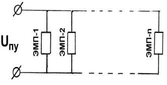 In the case of automatic fire-extinguishing systems creation on the basis of several SPRUT modules it is necessary to provide their simultaneous triggering. For this EMA must be connected in a parallel way to the source of starting signal Ustart of control unit. It is possible to use control devices that form starting signal with voltage 12 або 24 V and provide parameters of EMA starting voltage, mentioned above. Duration of starting impulse Тstart 0,1 с.