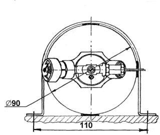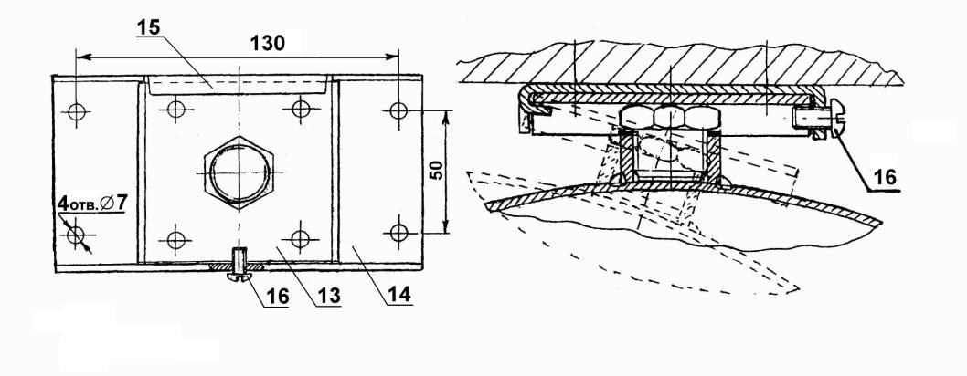 Figure 2 illustrates mounting variant of modules using modified bracket 13 and platform 14 with holder 15 and check screw 16. Using this constructive variant provides more comfortable modules mounting on the ceiling, especially for dimension-types and EP charge of 9 kg and more. At that, the platform is firstly attached to the ceiling, and bracket 13 is twisted in the connecting pipe 11 (fig. 1). Module with the bracket installed on the platform 14, using holder 15 and check screw 16. For mounting modules SPRUT-3 and SPRUT-6 only usage of bracket 13 is possible.