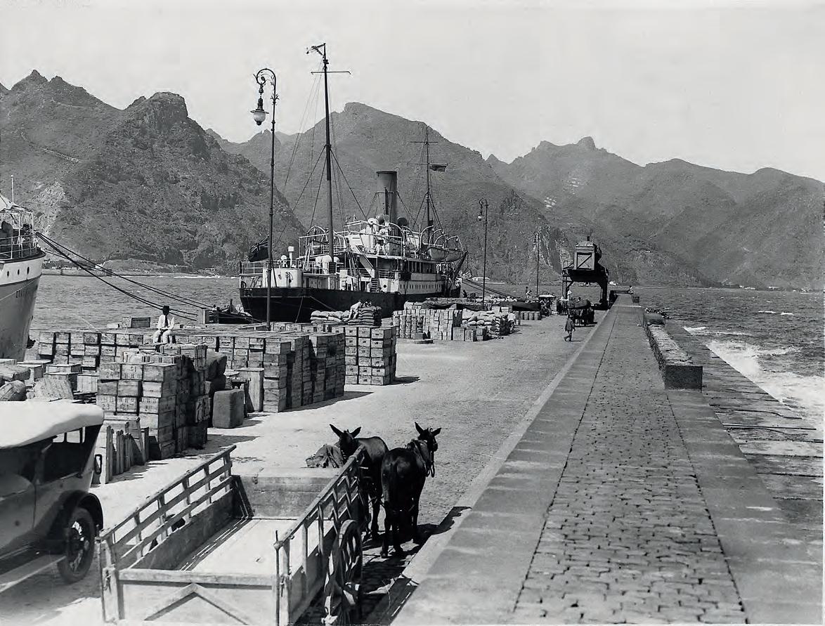 Cajas con productos que llegaban o partían al otro lado del oceáno, carros arrastrados por caballos y algún vehículo a motor casi como anécdota. Así era la animada vida de este puerto canario bajo montañas y cráteres. // Boxes of goods arriving or departing across the ocean, horse-drawn carts, and a few motor vehicles which were more of a curiosity. Such was the hustle and bustle at this Canary Island port nestled beneath mountains and craters.