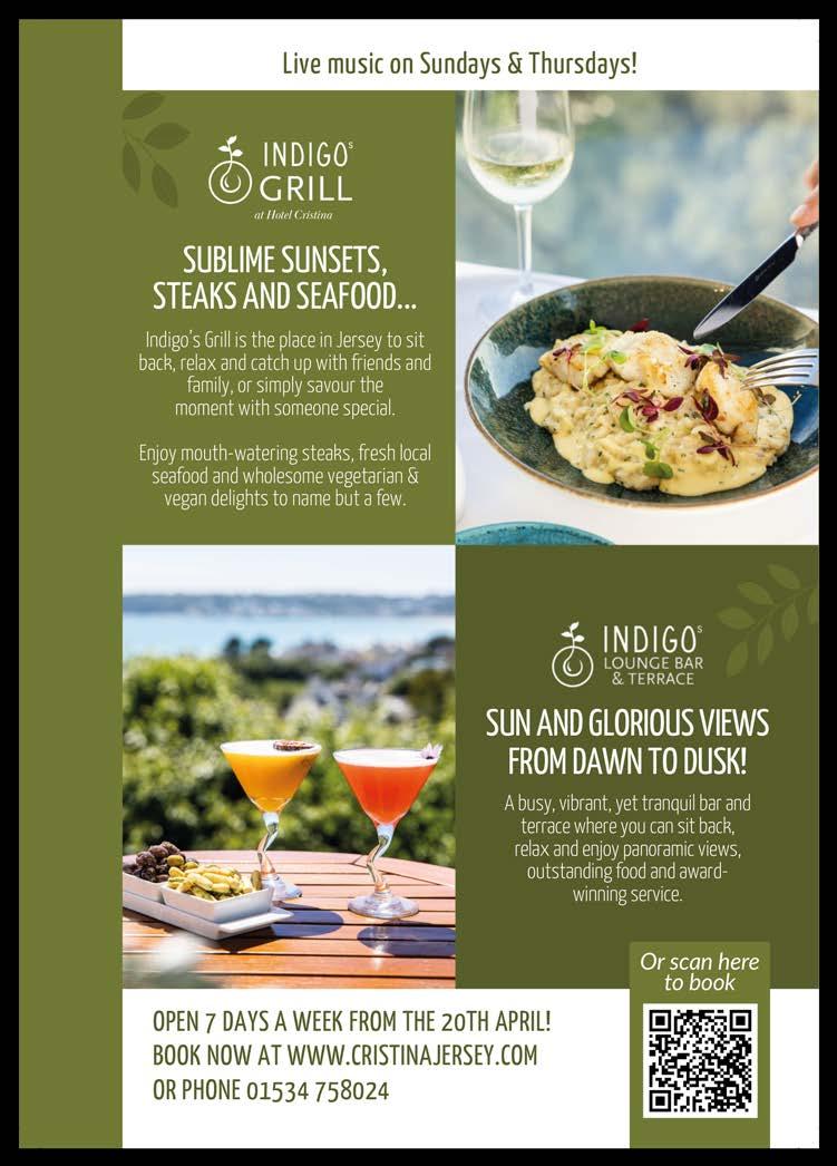 With commanding panoramic views over St Aubin’s bay and a stunning south-facing terrace, Indigo’s at the Cristina has become a much loved local favourite since it relaunched after the pandemic. Relaxing live music every Thursday evening & Sunday lunchtime, means Indigo’s Lounge Bar & terrace fills weeks in advance with revelers looking to enjoy the sun and a few cocktails. In the evening Indigo’s grill is a perfect romantic date spot, with unmissable sunset views over the St Aubin headland. The local seafood and prime British meats compliment the unbelievable views perfectly!