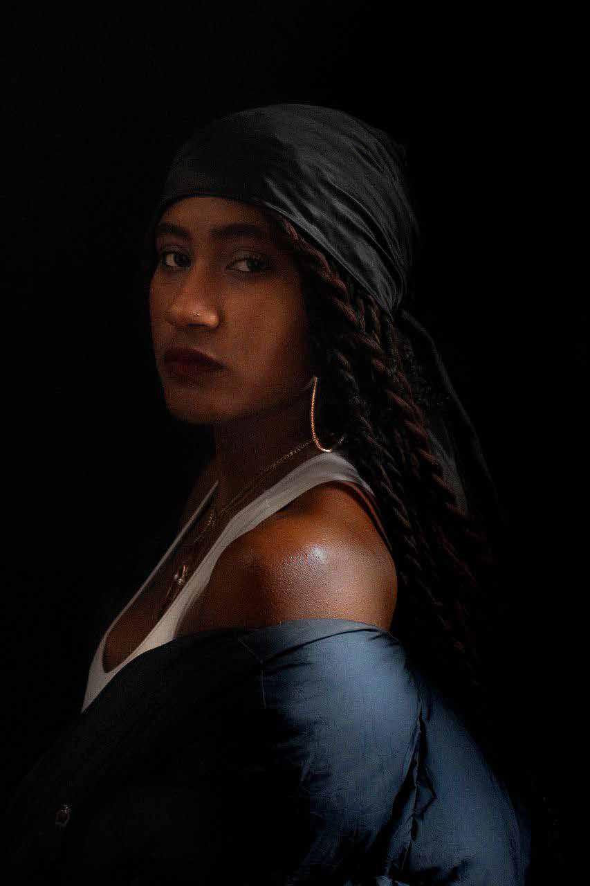 "Perla negra" Inspirados en 'La chica de la perla', optamos por inmortalizar la imagen de una mujer afrodescendiente luciendo la tradicional candonga, una joya emblemática de su cultura. A través de este contraste cultural, exhibimos la belleza y el estilo único de la mujer negra."