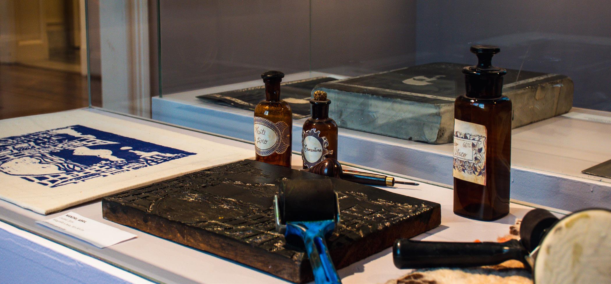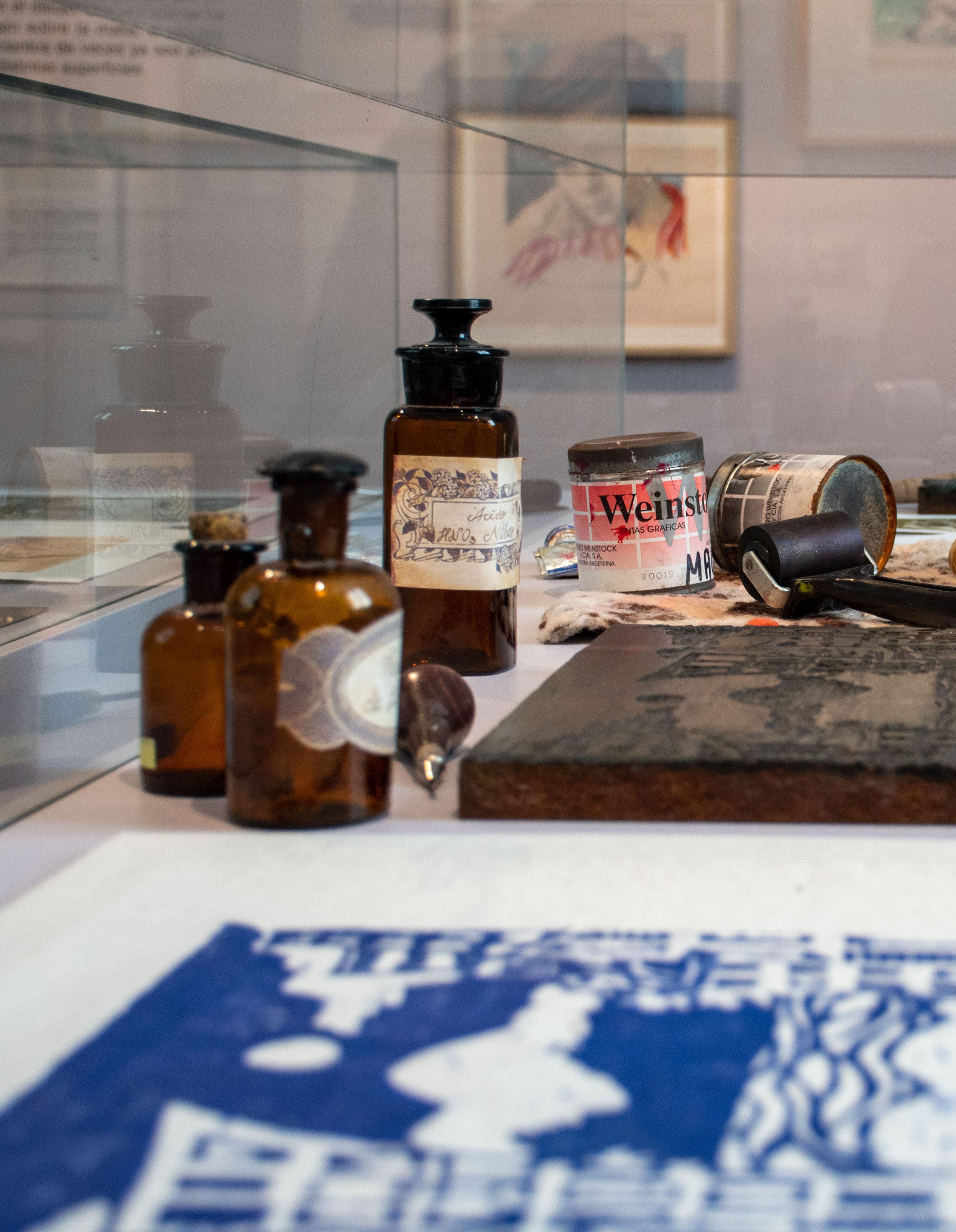 maestro grabador Néstor Goyanes, integrada por obras de notables artistas contemporáneos. La sala contigua muestra los grabados de la colección del MAT de los grandes maestros: Benito Quinquela Martín, Horacio Butler, Antonio Berni, Guillermo Roux y Eduardo Iglesias Brickles, junto a vitrinas con herramientas, matrices, frascos de ácido, fieltros y piedras litográficas.
