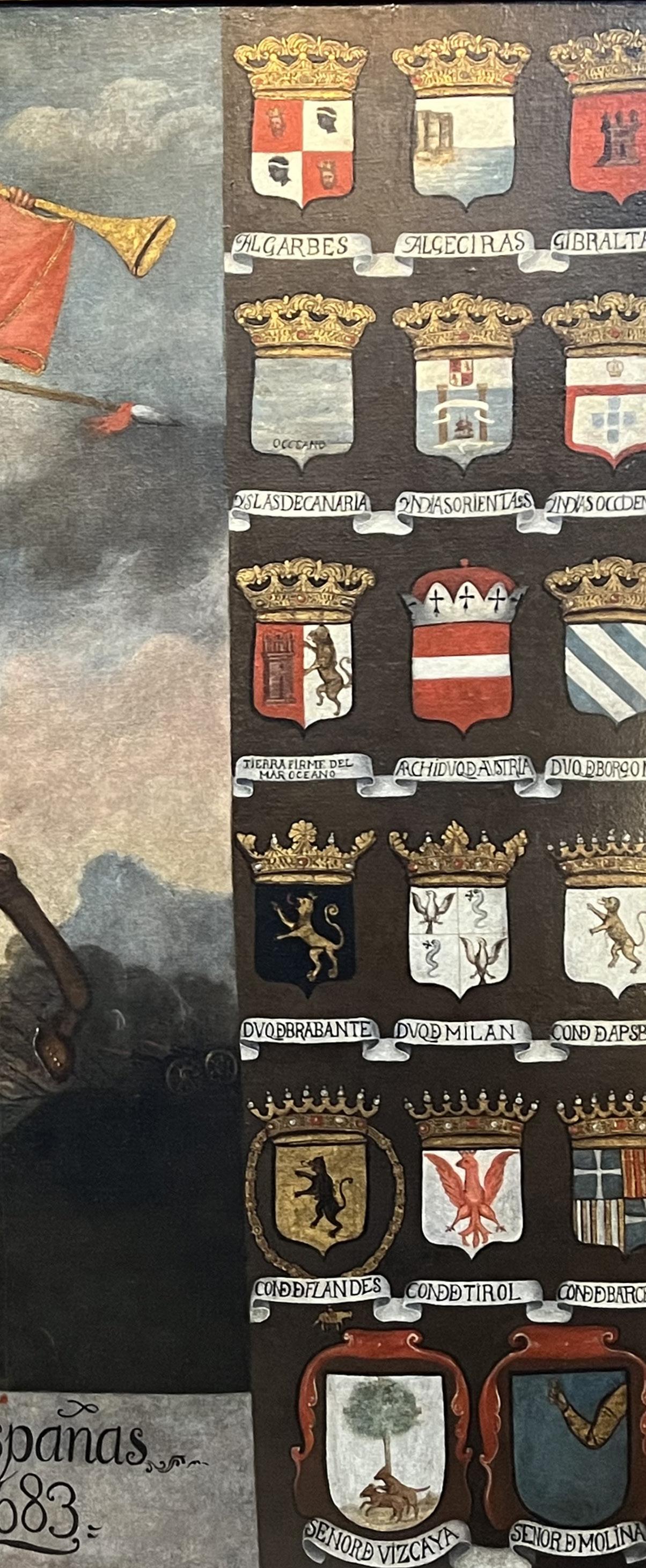 de un cortejo real y flanqueado por los escudos de varios títulos, reinos y posesiones en tres continentes. Este último motivo de los blasones se replica en un lienzo americano, existente en Buenos Aires, ciudad que alguna vez estuvo en las márgenes de su extensísimo imperio.