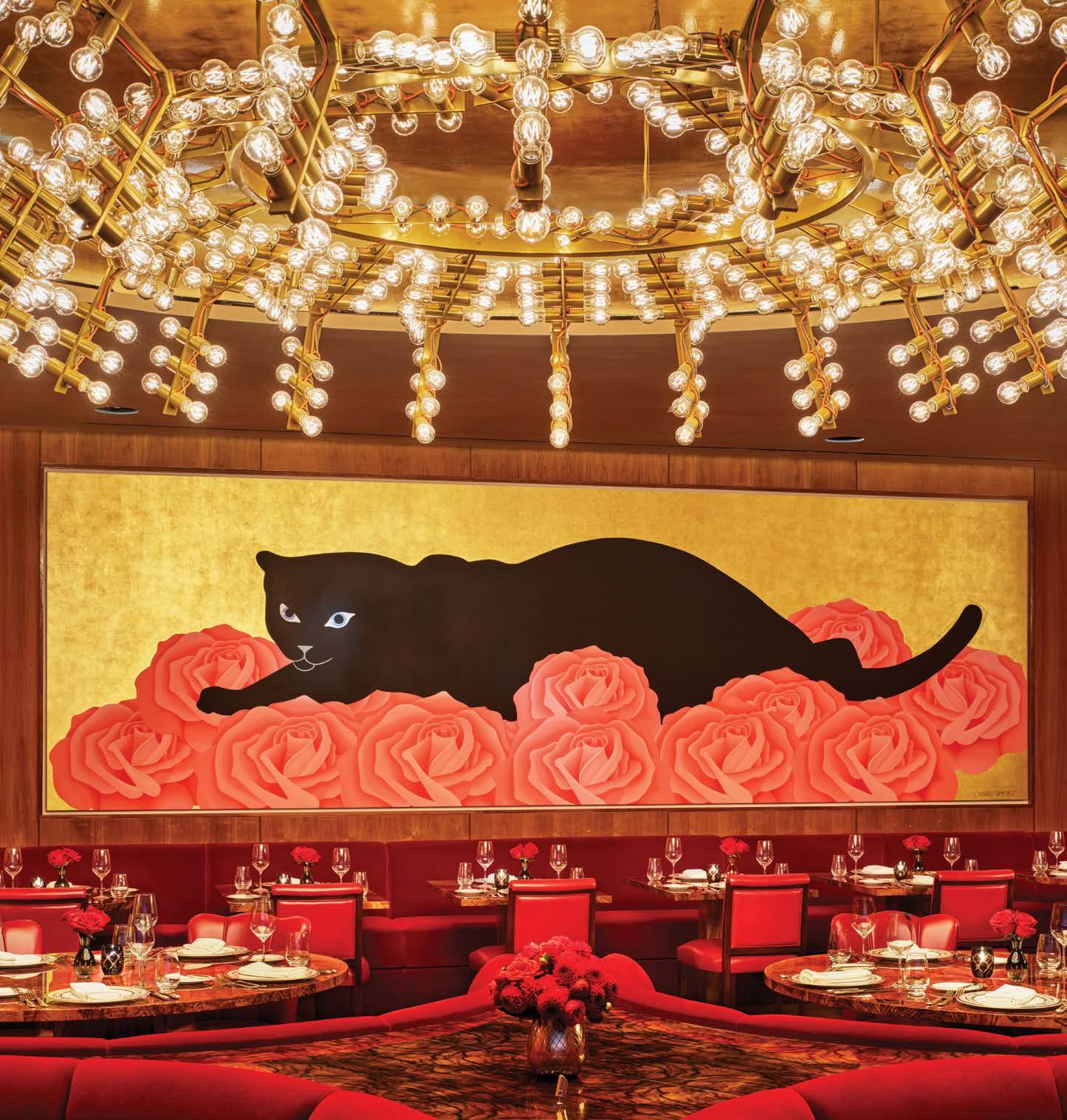Edgardo Giménez brings his unmistakable visual language to La Boca by Francis Mallmann. His whimsical Monas, playful, dreamlike figures brimming with color and irreverence, are reimagined on a monumental scale for the restaurant’s grand salon, their joyful presence infusing the space with a spirit of wonder. Giménez presents three murals that distill the essence of his vibrant world: intense colors, exuberant shapes, and the gleam of gold leaf revaluing icons from his imagery—roses, panthers, monkeys, and a single egg split open to reveal a surreal sky within. These works transform the space into scenes of dreamlike opulence, where art, design, and fantasy merge into an unforgettable sensory experience.