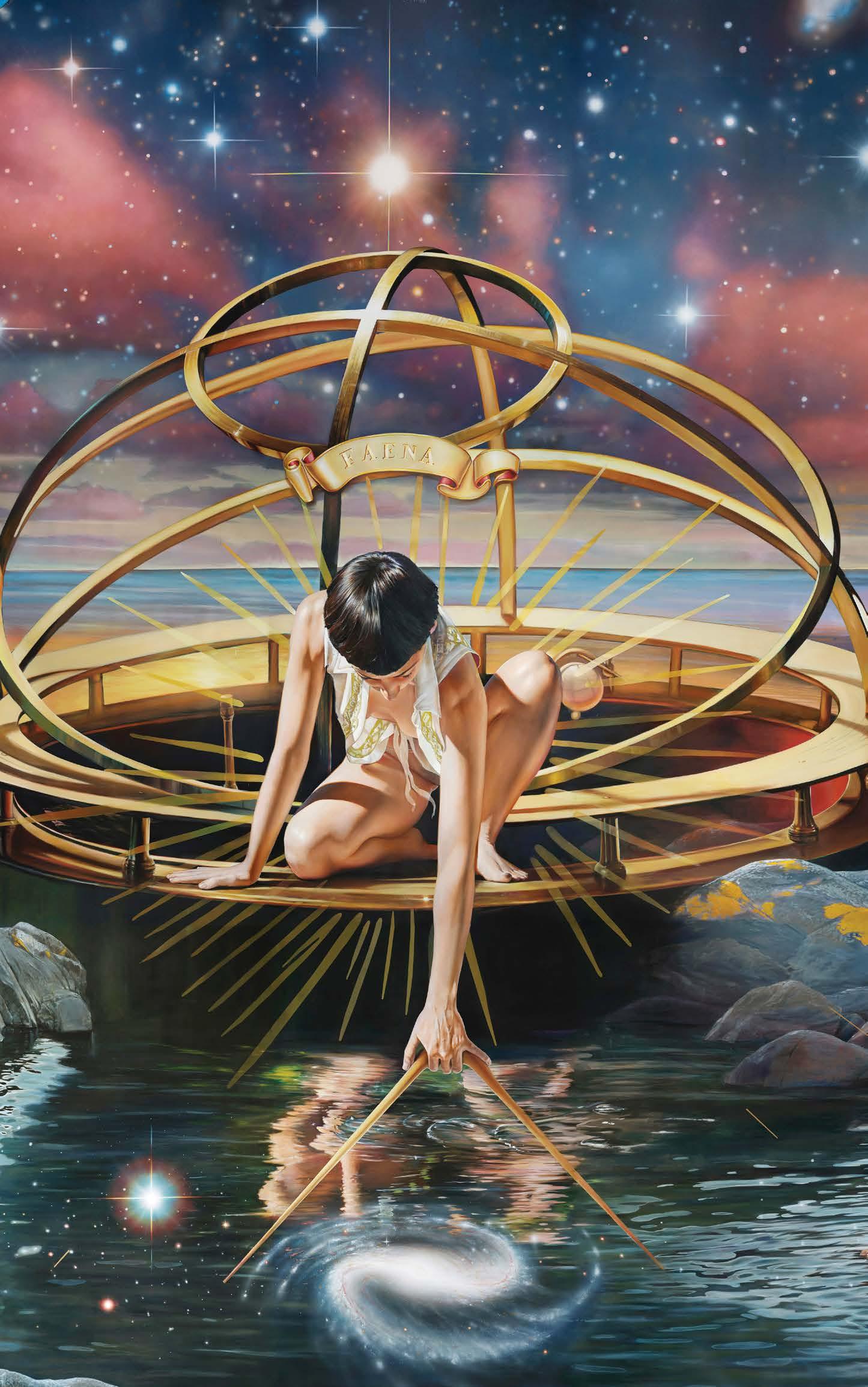 Ascension unfolds as a cyclical narrative of self-discovery, awakening, and our place within the cosmos. Monumental figures anchor moments along this journey, embodying the tension between ego and spiritual transformation. From left to right, time transitions, moving through stages of wisdom and understanding from day into night and birth into rebirth. At the center, the Colossal Woman embodies the feminine as an essential force of cosmic harmony. Hidden throughout the mural, smaller vignettes weave stories of creation and transformation. The journey begins with the unmanifested potential of the Cosmic Egg and culminates in the realized unity of self and Cosmos. This site-specific mural was commissioned by Faena and conceived specifically for the monumental scale and spiritual resonance of the Cathedral at Faena New York