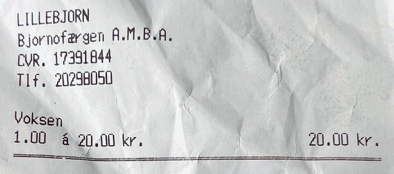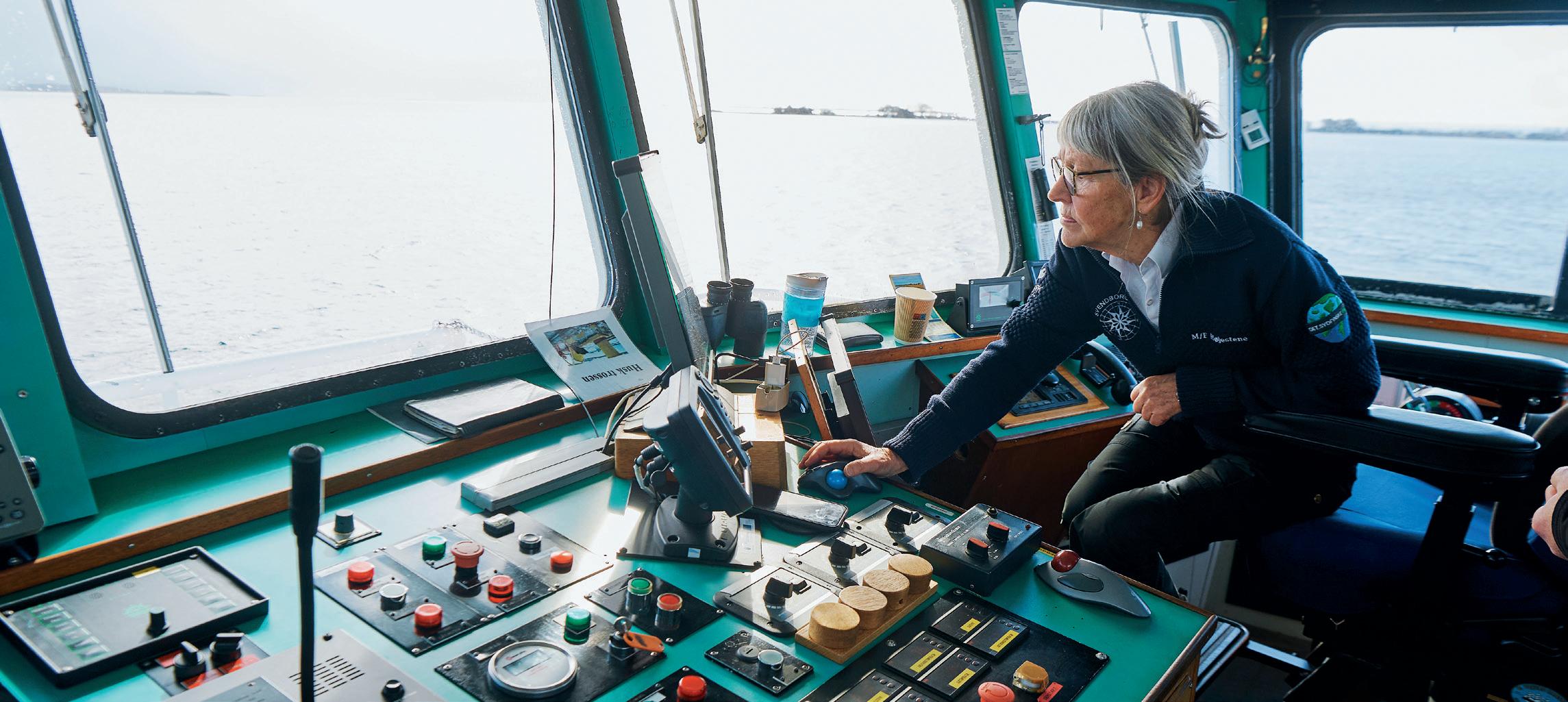 På denne tågede og småfugtige forårsdag skærmer vi os i færgens dækssalon. Under den korte overfart får Eva M. Terkelsen forklaret, hvorfor det er vigtigt at passe godt på øens livsnerve, Lillebjørn: ”Besætningen er godkendt til kun en person. Det er, hvad vores økonomi kan bære. Hvis vi får en anden færge eller ombygger Lillebjørn, har vi fået oplyst, at denne dispensation ikke følger med,” fortæller Eva M. Terkelsen.