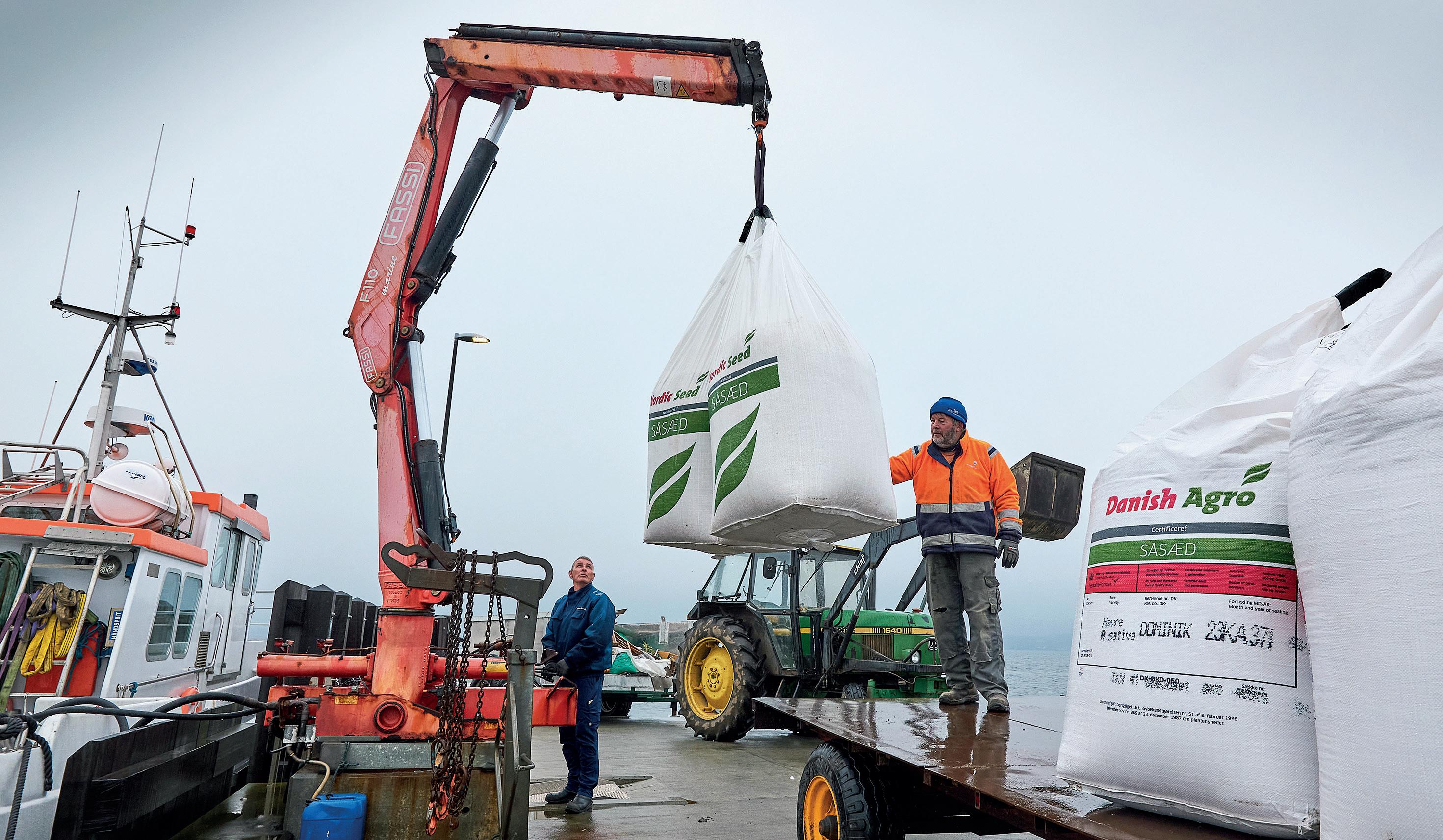 Ved ankomsten til øen holder landmand Kim Christensen klar med traktor og anhænger. Sammen med skipperen håndterer han losningen af de store sække.