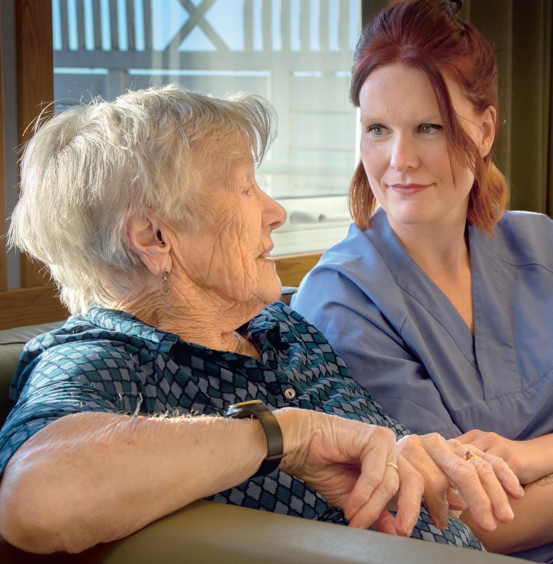 OMSORG: Beboer Astrid Skotnes (95) sier hun er takknemlig for mye i livet, og liker godt en stund med helsefagarbeider Monica Johnsen.