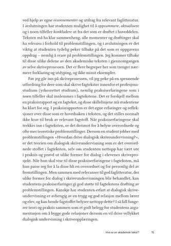 ved hjelp av egne resonnementer og utdrag fra relevant faglitteratur. I avslutningen har studenten mulighet til å oppsummere, aktualisere og i noen tilfeller konkludere ut fra det som er drøftet i hoveddelen. Teksten må ha klar sammenheng, alle momenter og drøftinger skal ha relevans i forhold til problemstillingen, og i avslutningen er det viktig at studenten tydelig peker tilbake på det som er oppgavens oppdrag – nemlig å svare på problemstillingen. Jeg kommer tilbake til disse ulike delene av den akademiske teksten i gjennomgangen av selve skriveprosessen. Det er flere begreper her som trenger nærmere forklaring og utdyping, og ikke minst eksempler. Før jeg går inn på skriveprosessen, vil jeg peke på en spennende utfordring for dere som skal skrive fagtekster innenfor et profesjonsstudium (yrkesrettet studium), nemlig praksiserfaringene som i noen tilfeller skal innlemmes i fagtekstene. Det er forskjell mellom en praksisrapport og en fagtekst, og disse skillelinjene må studentene ha klart for seg. I praksisrapporten er det egne erfaringer og refleksjoner over disse som er hovedsaken i teksten, og det stilles normalt ikke krav til bruk av relevant fagstoff. Når praksiserfaringene skal trekkes inn i fagteksten, er det derimot for å belyse overordnede og ofte mer teoretiske problemstillinger. Dersom en student jobber med problemstillingen «Hvordan drive dialogisk skriveundervisning?», er det teorien om dialogisk skriveundervisning som er det overordnede stoffet i fagteksten, selv om studenten nettopp har vært ute i praksis og prøvd ut ulike former for dialog i elevenes skriveprosjekt. Når hun skal vise til disse praksiserfaringene i fagteksten, må hun passe seg for å la disse bli en overordnet og for personlig del av fremstillingen. Men sammen med referanser til god faglitteratur, der ulike former for dialog i skriveundervisningen blir behandlet, kan studentens praksiserfaringer gi god støtte til fagtekstens drøfting av problemstillingen. Kanskje har studenten erfart at dialogisk skriveundervisning er avhengig av en trygg og god relasjon mellom lærer og elev, og kan hende fagstoffet belyser nettopp dette? I så fall fungerer teori og praksis sammen som et godt belegg for studentens argumentasjon om å bygge gode relasjoner dersom en vil drive vellykket dialogisk undervisning i skriveopplæringen. Hva er en akademisk tekst?