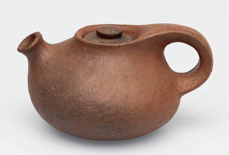[6] Gutte Eriksen, tekanne, uglasert, hardbrent leirgods med chamotte, ca. 1950, 10,8 × 19,3 × 14,7 cm (VK.1950037). Danske Gutte Eriksen var sterkt inspirert av dei tradisjonelle jydepottene. Også Alf Rongved, som var praktikant hjå Gutte Eriksen fleire somrar i 1940åra, lét seg påverke av denne typen material, form og fargebruk. Foto: Dag Fosse/Kode