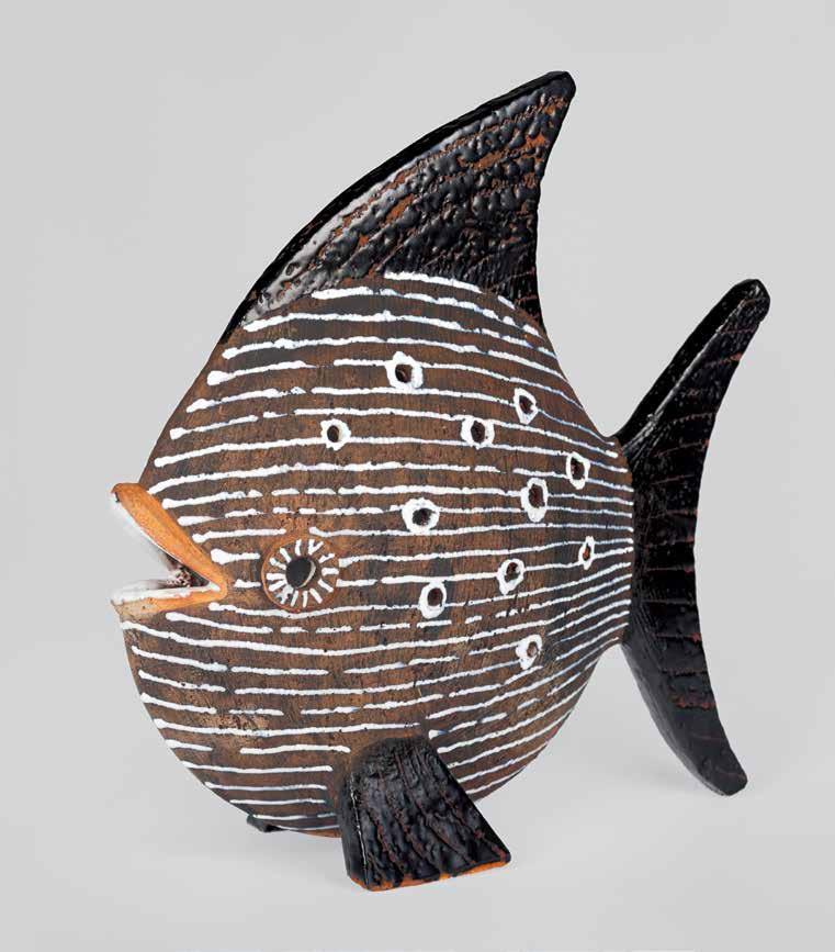 [10] William Knutzen, skulptur, 1950, delvis glasert leirgods med chamotte, 36 × 33 cm (VK.1950121). William Knutzen eksperimenterte med form og hadde gjerne eit røffare keramisk uttrykk enn sine samtidige. Verket vart kjøpt inn til Vestlandske kunstindustrimuseum frå Prydkunst – Hjertholm, som var ein av fleire butikkar som selde keramikk i Bergen kring siste verdskrig. Foto: Dag Fosse/Kode