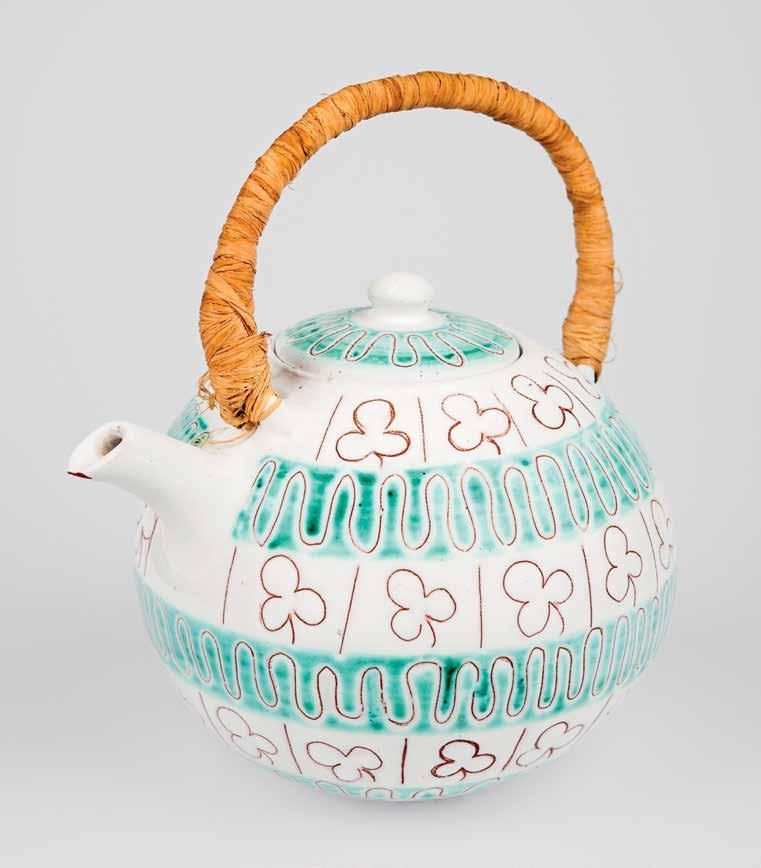 [7] Alf og Kari Rongved, tekanne, 1949, tinnglasert leirgods, 21 × 19 × 15,5 cm (VK.2003004). Tekanna høyrer til den aller første produksjonen til Alf og Kari Rongved og vart selt til den danske «piken» i hovudhuset. Sjølve hadde dei installert seg med bustad i garasjen. Femti år seinare kom kanna attende til Alf og Kari Rongved som gåve frå den same «piken». Foto: Dag Fosse/Kode