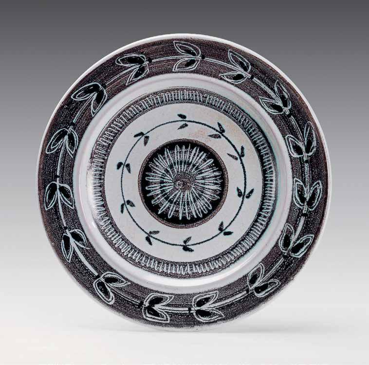 [5] Jens von der Lippe, tallerken, 1947, tinnglasert leirgods, 22,8 × 2,3 cm (OK18069). Jens von der Lippe var i lang tid tonesetjande for den norske keramikken. Han var skeptisk til entusiasmen kring steingods og meinte det einaste norske keramikarar evna nokolunde, var å lage «leirgods med hvit glasur og malt dekor».