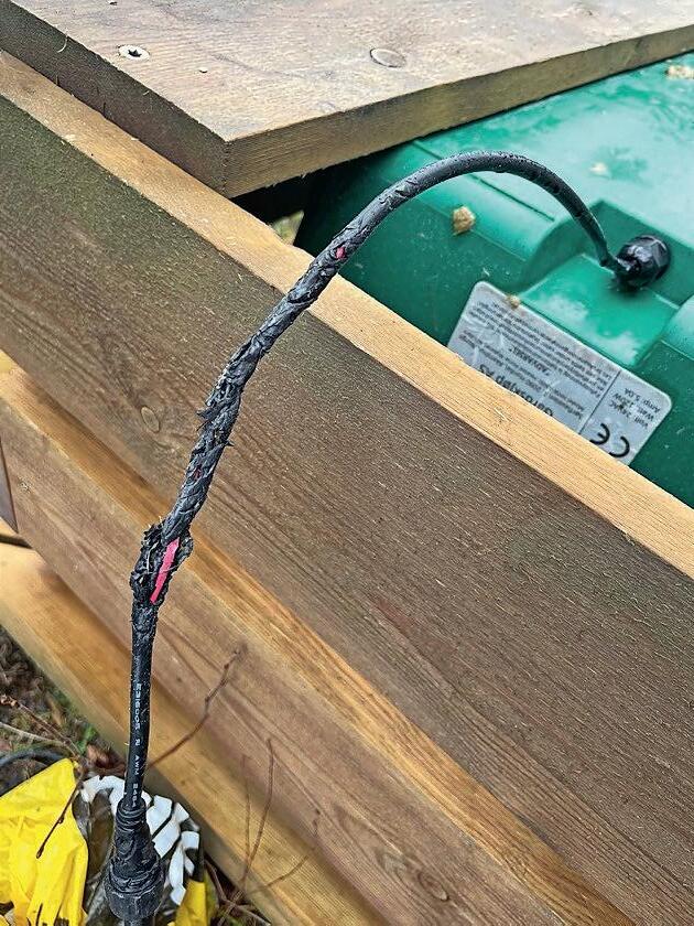 Denne ledningen lå tilgjengelig for en unghest som gnagde på den. Dette kunne ha forårsaket brann. Spesielt unghester er nysgjerrige og utforsker ting med munnen.