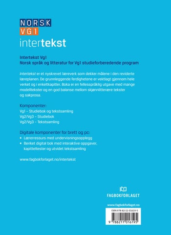 Digitale komponenter for brett og pc: • Lærerressurs med undervisningsopplegg • Beriket digital bok med interaktive oppgaver, kapitteltester og utvidet tekstsamling www.fagbokforlaget.no/intertekst
