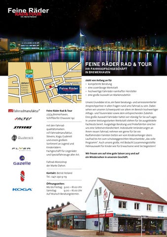 Feine Räder Rad & Tour 27574 Bremerhaven, Schiffdorfer Chaussee 192 mit den Fahrradqualitätsmarken: vsf-Fahrradmanufaktur, Stevens, Koga, Gudereit und einem großem Sortiment an Jugend und Kinderrädern. Fachgeschäft für Liegeräder und Spezialfahrzeuge aller Art. Faltrad-Monoshop der Marke Dahon. Kontakt: Bernd Heiland Tel.: 0471 290 9 119 Öffnungszeiten: Mo bis Freitag: 9.00 – 18.00 Uhr Samstag: 9.00 – 16.00 Uhr Auf Wunsch Beratungstermin.