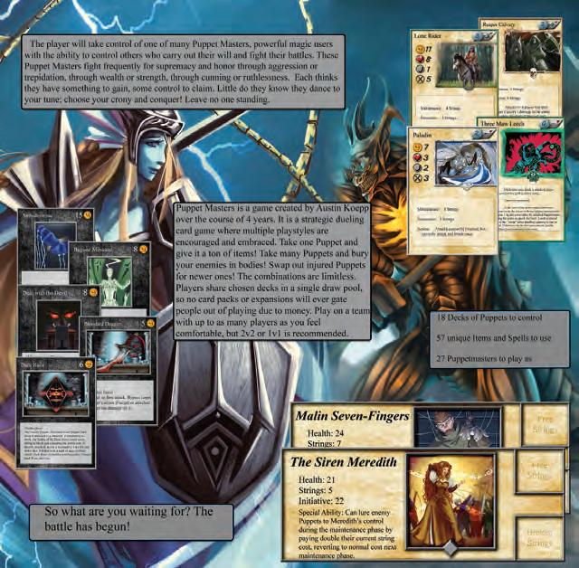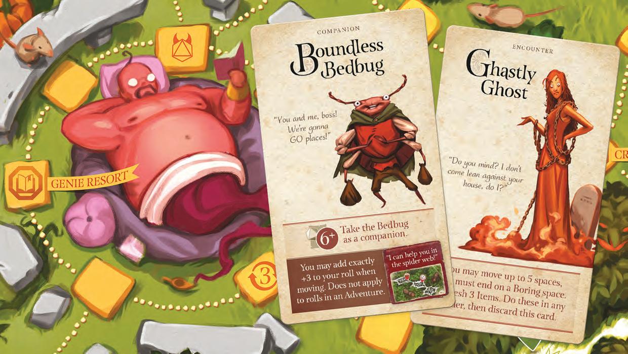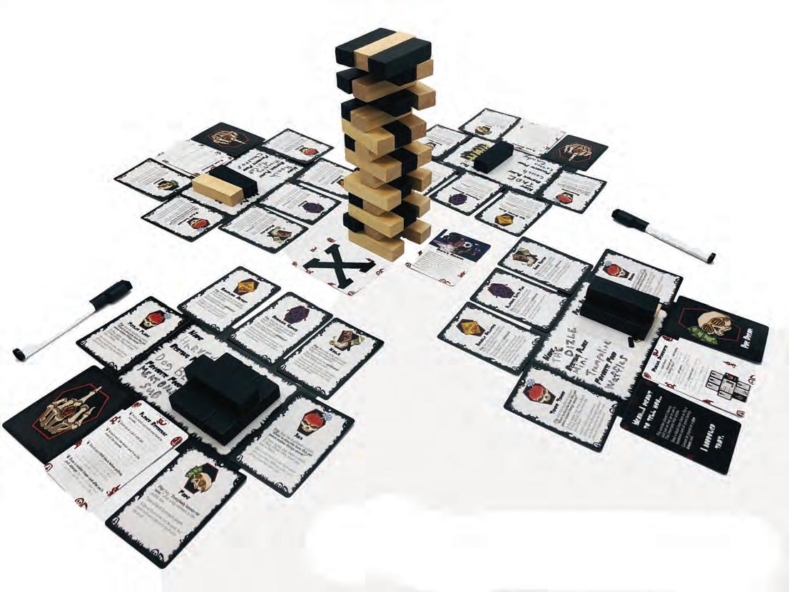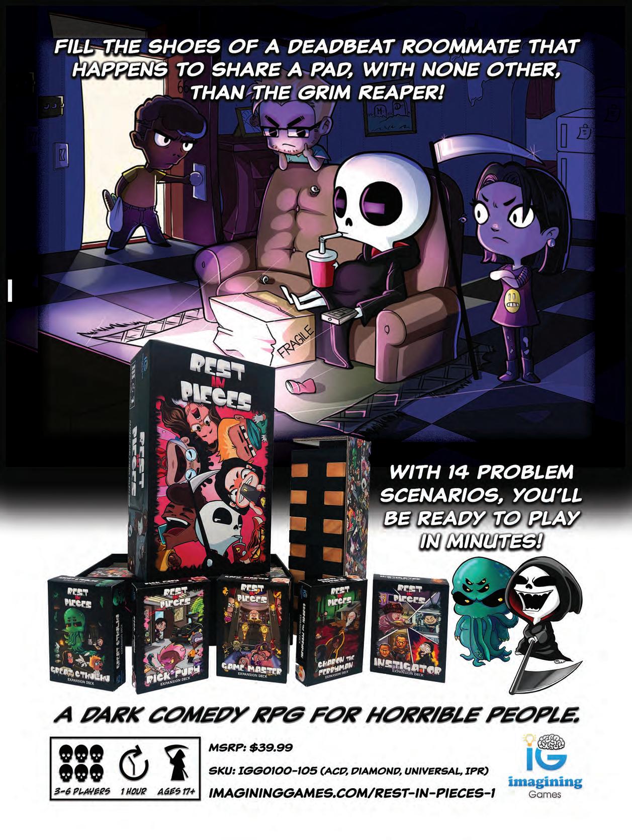 With our new release, we’ve spawned a lovechild of Dread and Fiasco that is sure to entice new players to the hobby. Rest in Pieces is a dark comedy RPG inspired by the misadventures, cartoon logic, and over-thetop characters of slacker sitcoms like The GrimAdventuresofBilly&Mandy,The RegularShow,Rick&Morty, and It’sAlways SunnyinPhiladelphia. You play deadbeat roommates characterized by their dead-end jobs, odd hobbies, and deadly objects, using colorful dry-erase character sheets and cards to create characters in minutes. It plays in short sessions of about an hour, paced by a two-color block tower highlighting selfish actions versus selfless ones. Whatcango wrong,doesgowrong in the hilarious hijinks of Rest in Pieces.