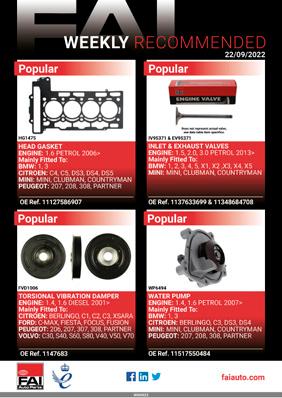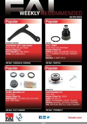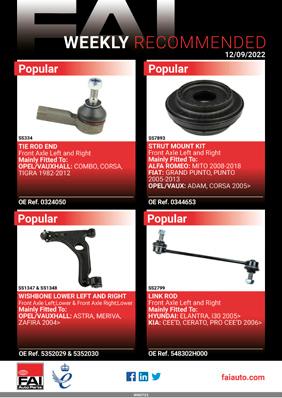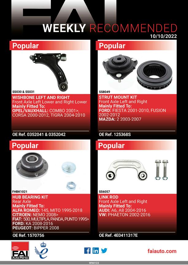 Your monthly update Steering & Suspension FAI’s Steering & Suspension range is constantly being improved with the introduction of new part numbers; fitting a wide range of applications. Dozens of new parts will be added in the coming months which we’ll keep you up to date with. Please see below for some of our latest new to range. » » SS10915 CITROEN BERLINGO (ER) 2018> SS10854 FORD FOCUS IV 2018> TIE ROD END LEFT SS10858 VAUXHALL CORSA V (F) 2019> LINK ROD FRONT SS10887 FIAT 500X 2015> FRONT LINK ROD SS10917 Top Pareto Risers New to Range Highlights 15 CITROEN BERLINGO (ER) 2018> SS10853 HYUNDAI KONA (OS) 2017> FRONT LINK ROD SS10714 MAZDA 2 (DL) 2014> WISHBONE FRONT LOWER LEFT SS10865 VW POLO (6R) 2009-2017 TIE ROD END LEFT SS10829 PEUGEOT 4007 2007> ANTI-ROLL BAR BUSH KIT REAR SS10724K SS10915 LINK ROD FRONT BERLINGO SS10853 BALL JOINT DUSTER FAI Focus October 2022 SS10854 SS10858 RACK END TIE ROD END LEFT KONA SS10714 LINK ROD BERLINGO MAZDA 2 SS10865 WISHBONE FOCUS